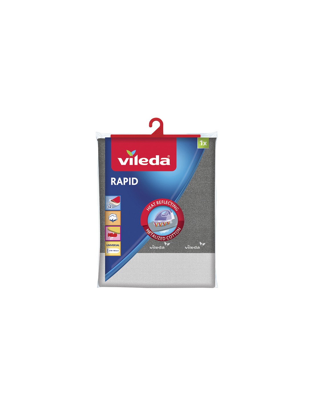 Funda metálica con partículas de aluminio para mayor rapidez en el planchado. compuesta por dos capas: algodón metalizado y espuma. fijación fácil con un clip. se adapta a todas las tablas con medidas de 110 x 30 cm y 130 x 45 cm