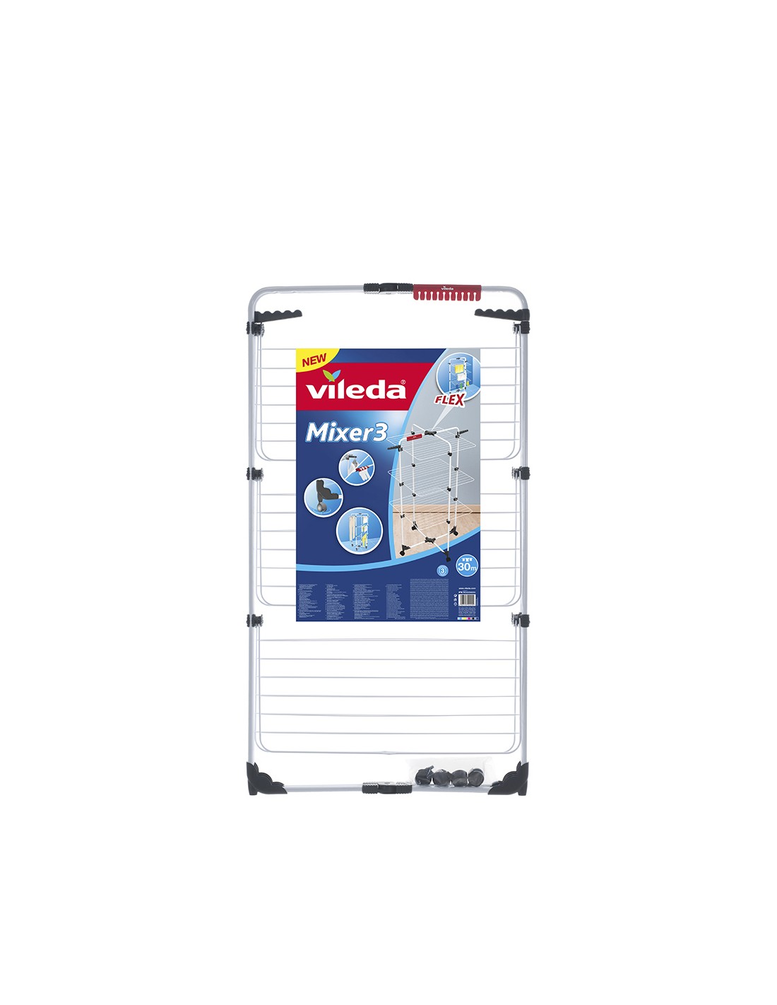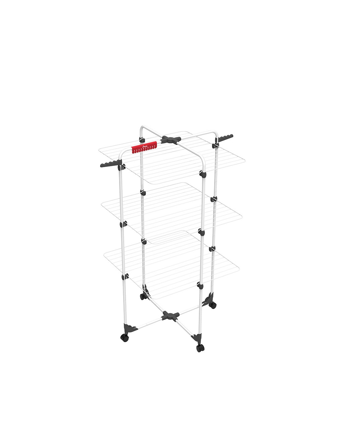 Tendedero torre mixer 3 esta hecho de acero con tres niveles. permite optimizar el espacio y a que se puede reducir a la mitad y usar en la cabina de la ducha. incorpora ruedas, accesorio para colgar prendas pequeñas y 2 colgadores para perchas. uso flexible y versátil. espacio de tendido 30 m