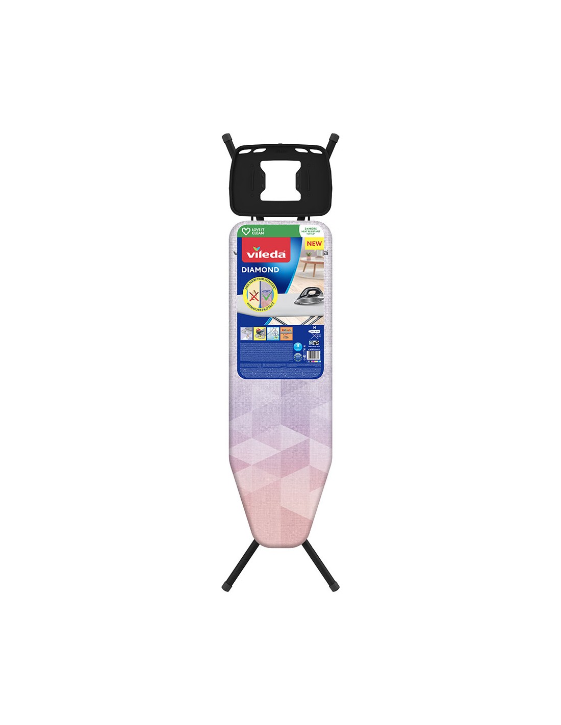 Tabla diamond, su funda con tratamiento titanio, recubrimiento de dióxido de titanio para una resistencia extra al calor (hasta 200°c) vs el algodón tradicional. sistema kid safe y colgador de perchas . con cierre de seguridad, cierre de transporte y agujeros para perchas. máxima seguridad y estabilidad. patas de ø28 mm y estructura de acero de alta calidad. espacio de planchado 120 x38 cm