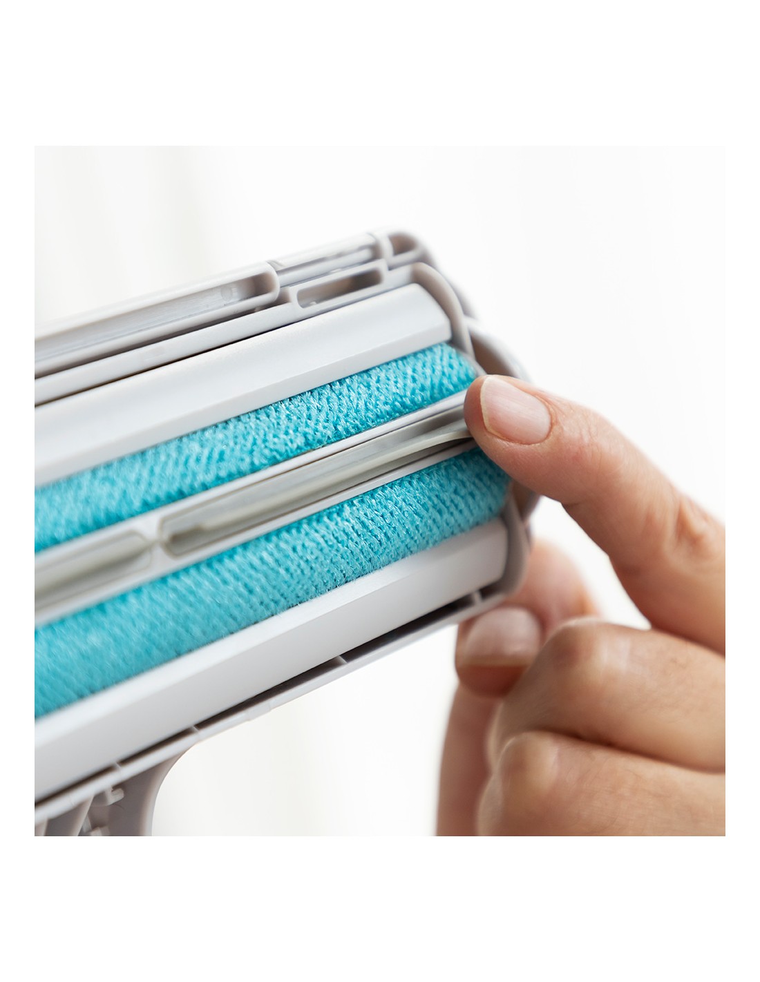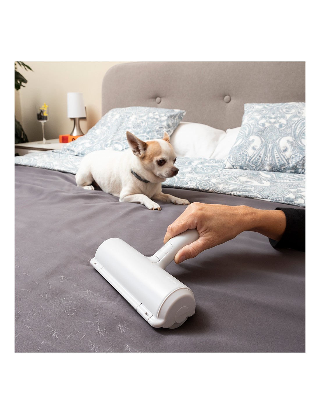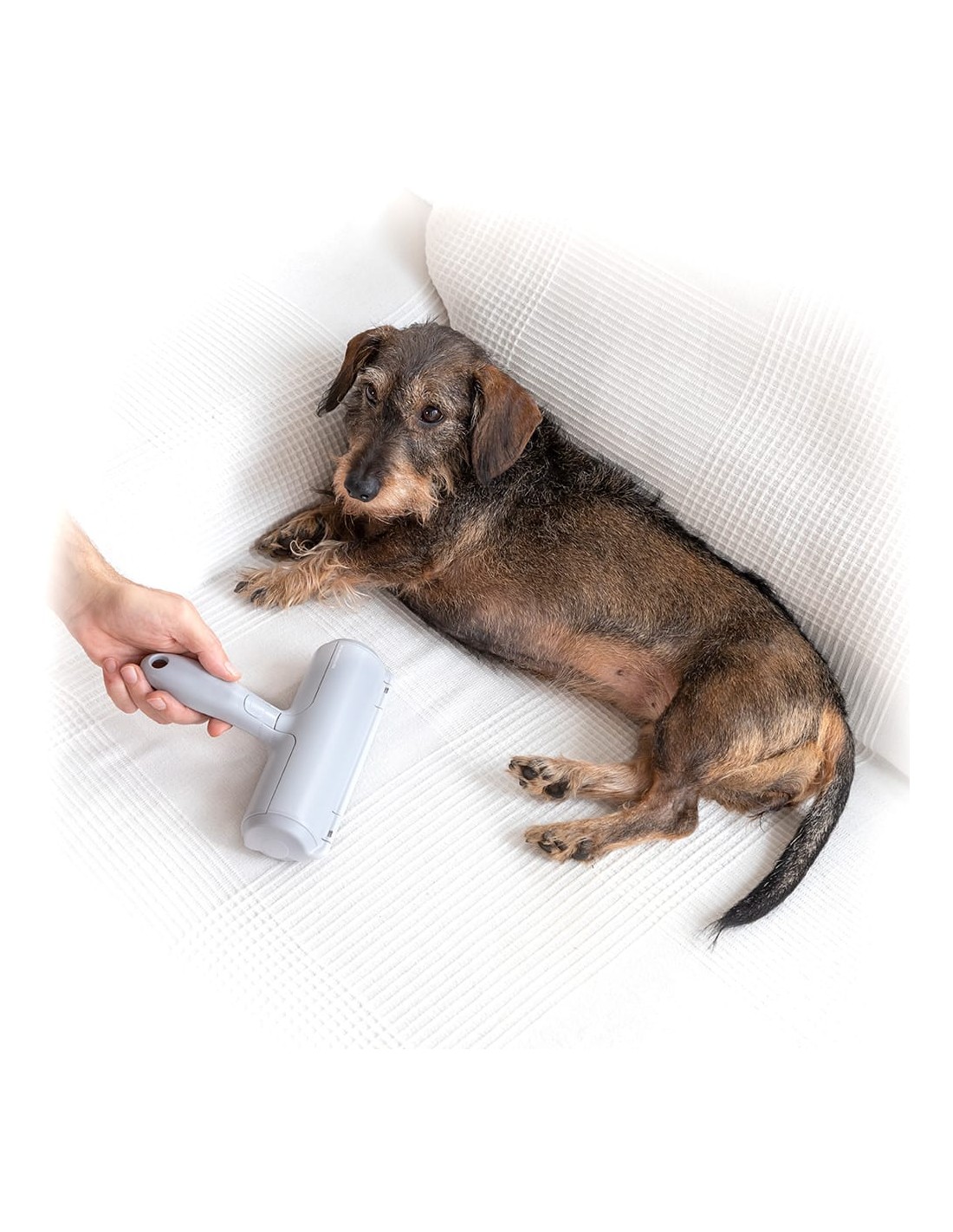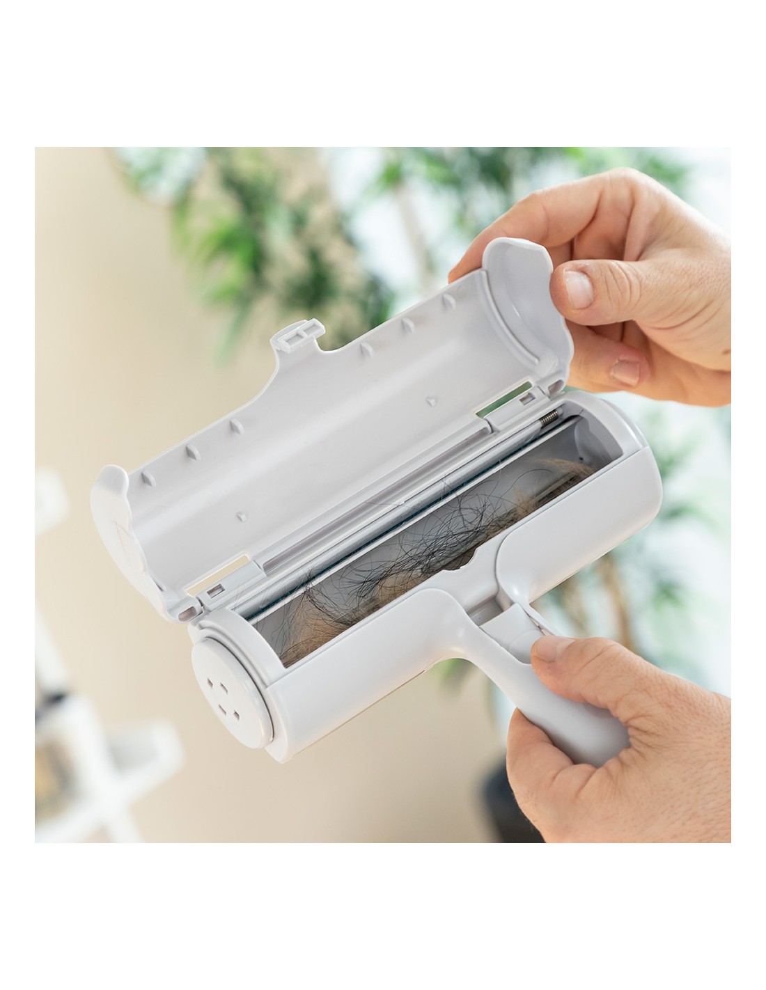 El rodillo quitapelos de mascotas elimina los pelos en multitud de superficies textiles del hogar, del coche, etc. material: abstpr nailon polipropileno. azul, gris. dispone de un deposito interno donde se van almacenando los pelos capturados, apto para eliminar pelusas. reutilizable, ecofriendly. se debe utilizar solo en superficies textiles. nunca sumergir, ni limpiar con agua. 18,5 x 20 x 5,3 cm