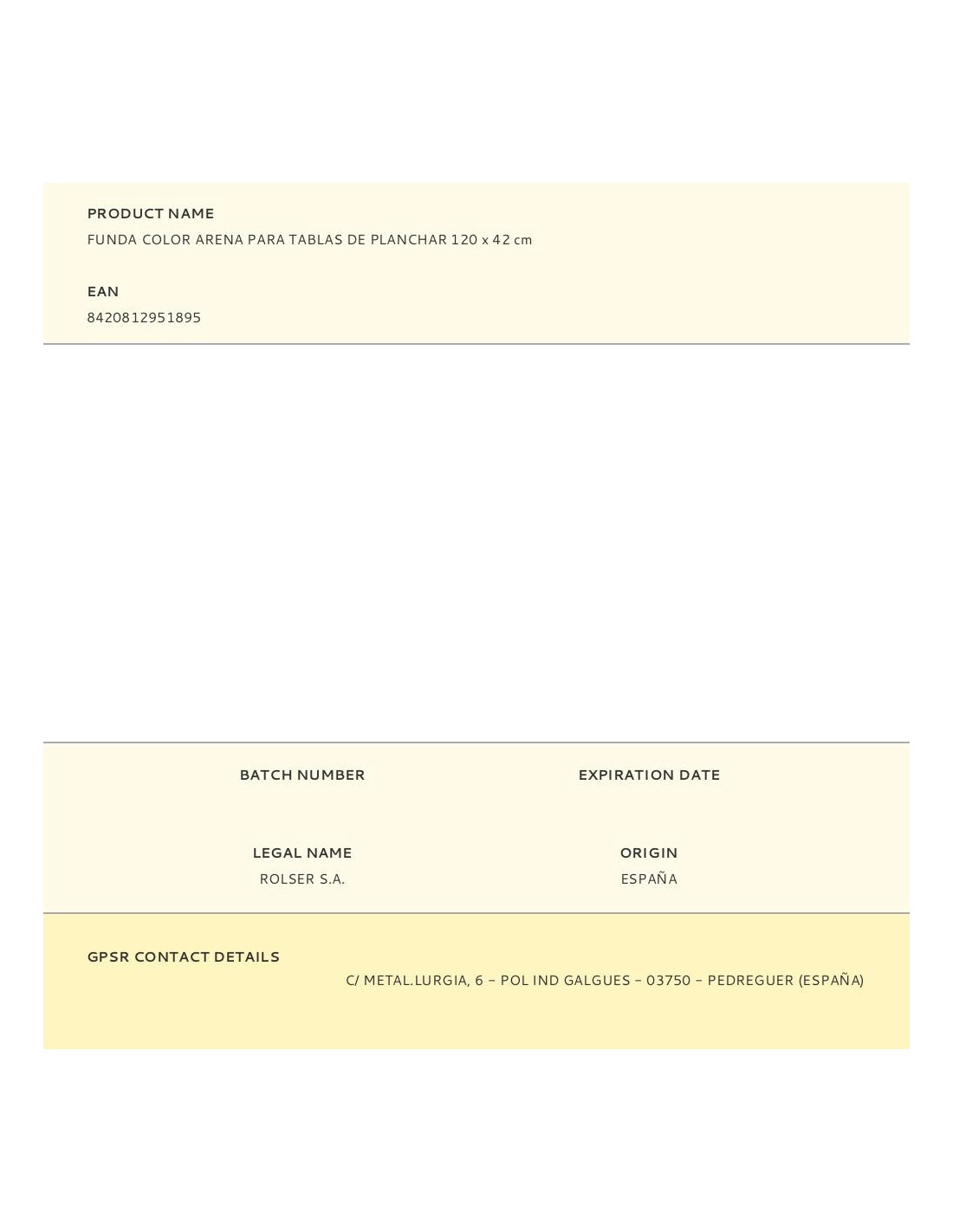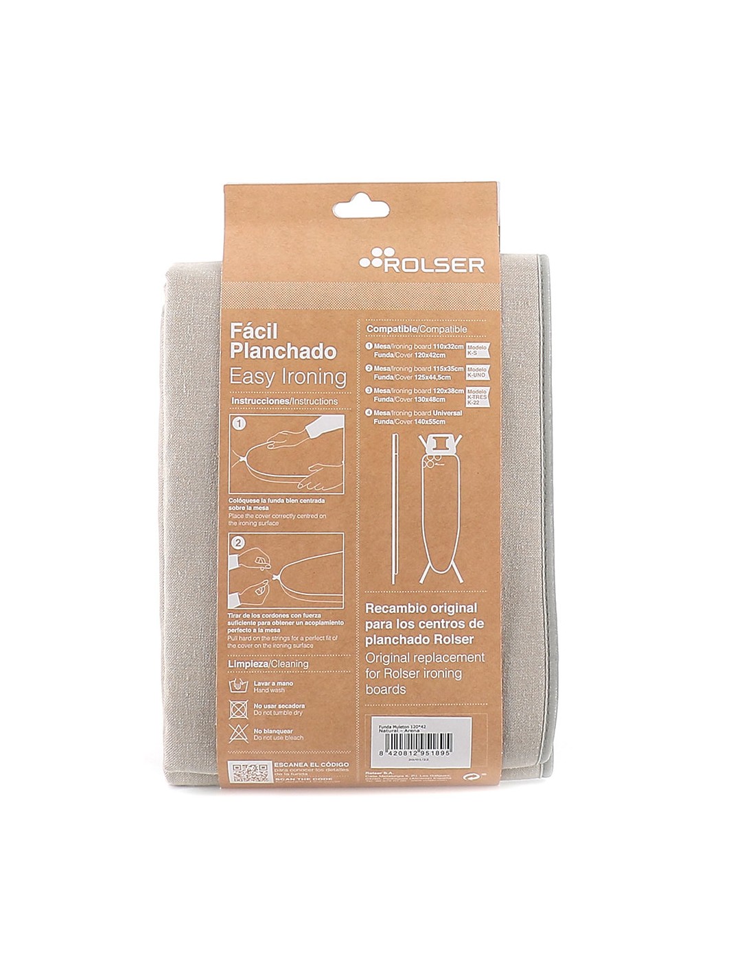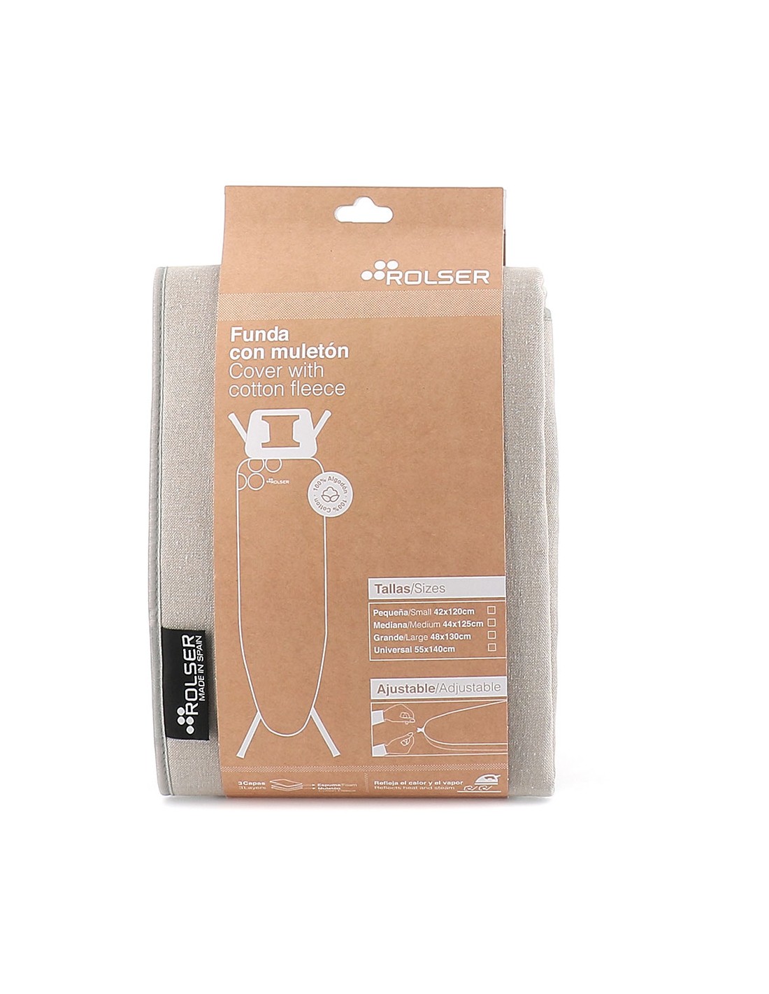 Funda color arena para tablas de planchar, talla s, de medidas aproximadas 110 x 32 cm, 100% algodón, con ajuste que se realiza mediante cierre de cordón fuerte que envuelve la funda alrededor de la tabla la base de muletón combinada con la tela superior, facilitan un deslizamiento cómodo. muletón 120 x 42 cm