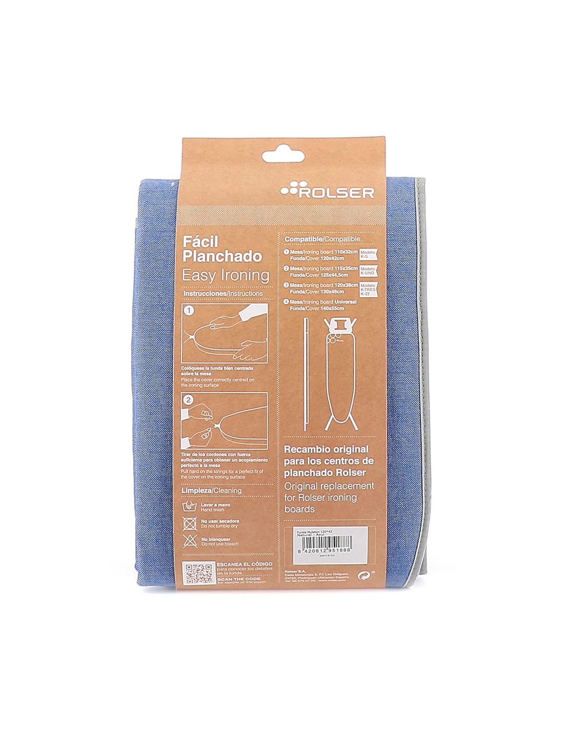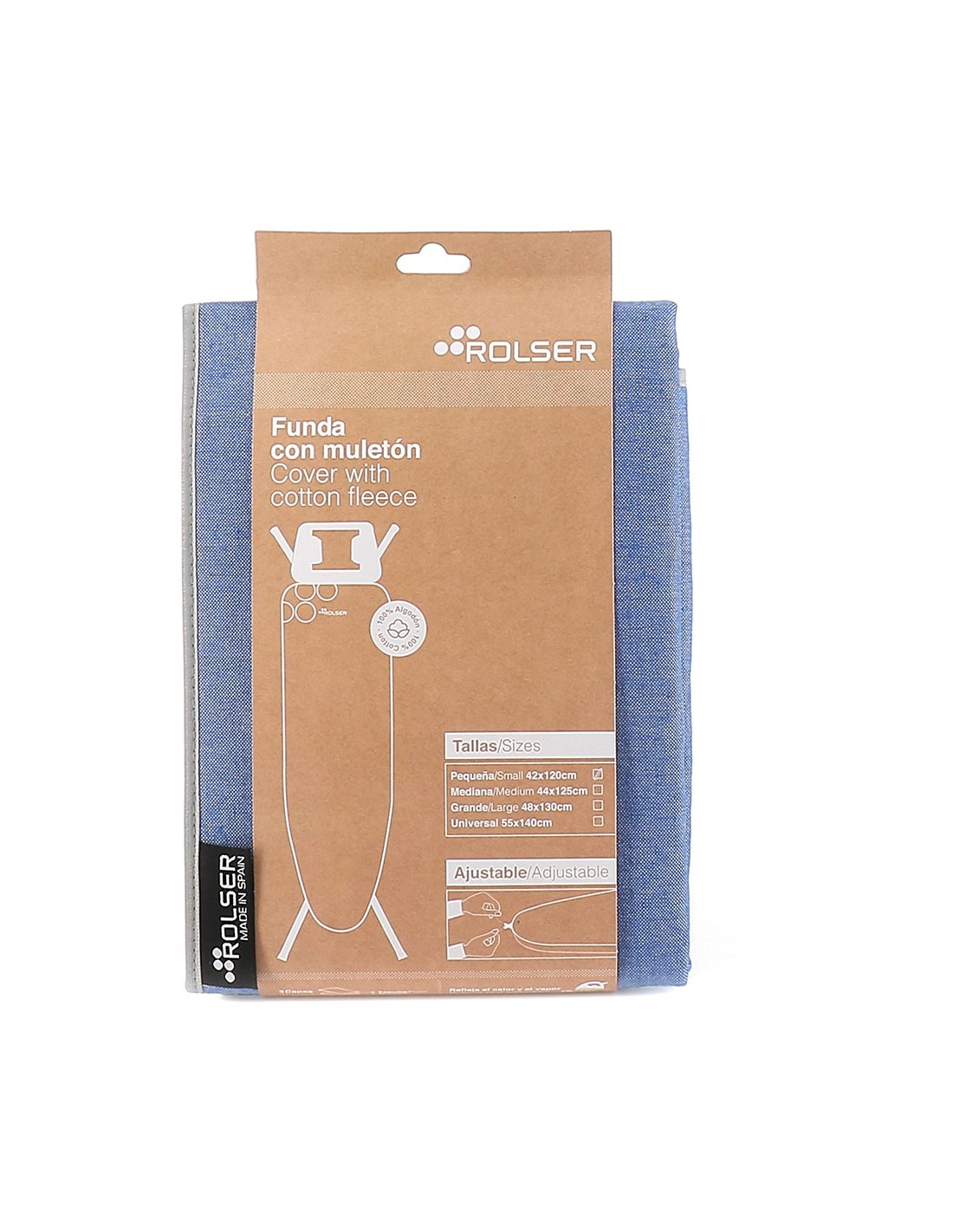 Funda color azul para tablas de planchar, talla s, de medidas aproximadas 110 x 32 cm, 100% algodón, con ajuste que se realiza mediante cierre de cordón fuerte que envuelve la funda alrededor de la tabla la base de muletón combinada con la tela superior, facilitan un deslizamiento cómodo. muletón 120 x 42 cm