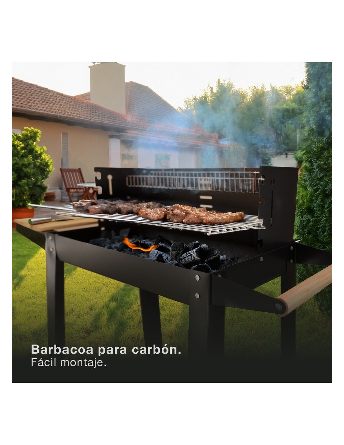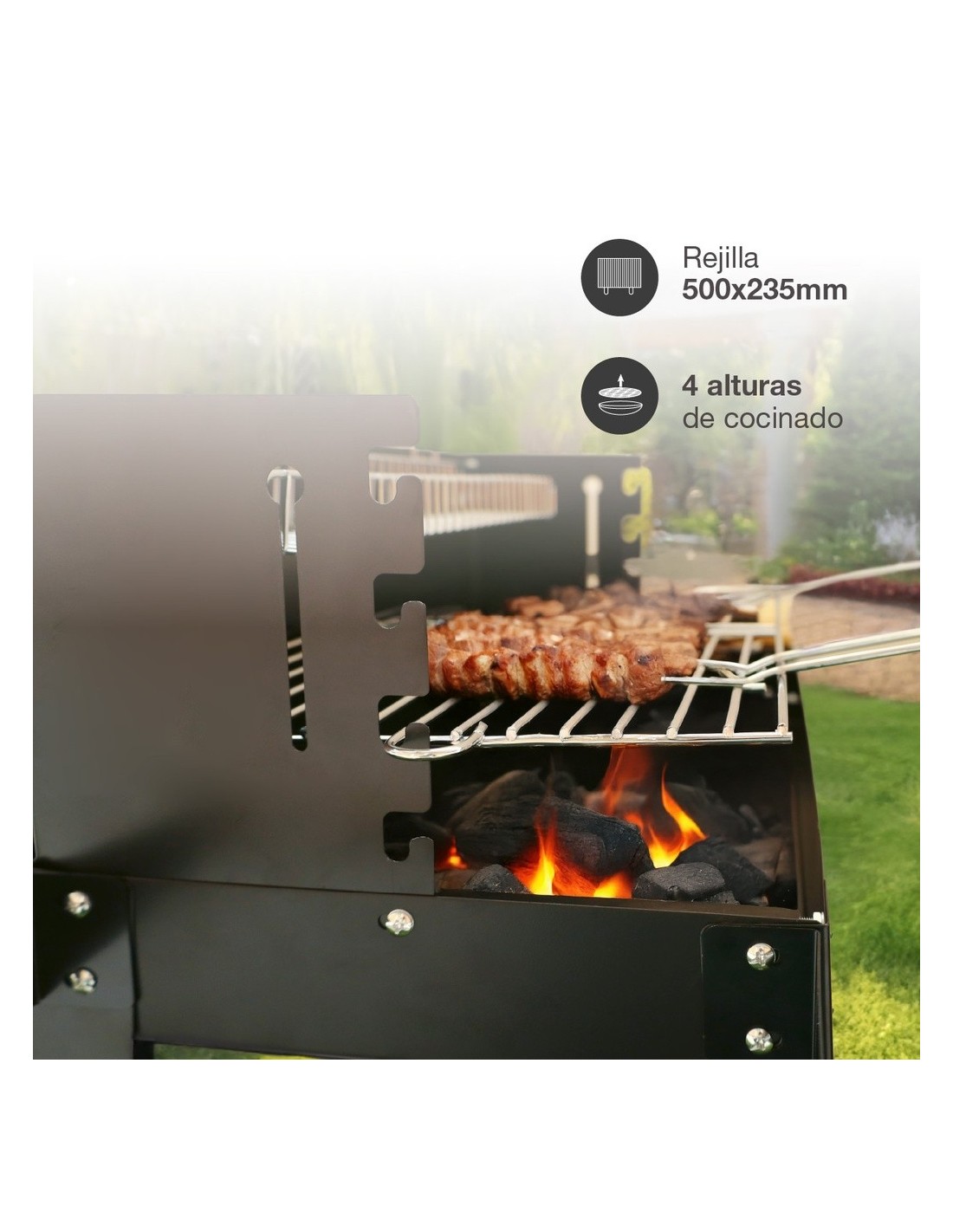 Controlar la intensidad del calor para cocinar todo tipo de alimentos en la barbacoa Musters es muy sencillo, gracias a sus cuatro alturas de cocción. Además, incluye una bandeja de madera lateral, ideal para apoyar platos y utensilios durante el cocinado.
