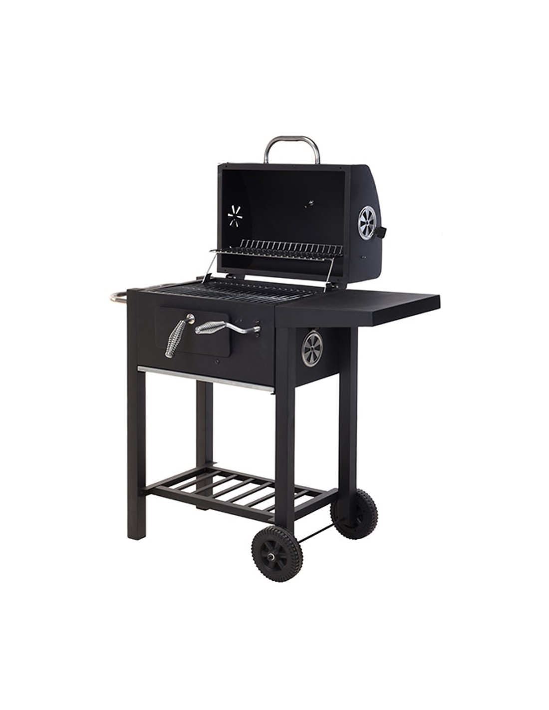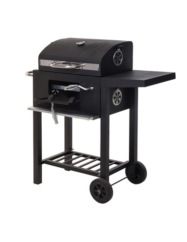Barbacoa de carbon con tapa 48,5x36x96cm (ancho/fondo/alto). amplia superficie de parrilla de aproximadamente 44x32cm. con bandeja de recogida de cenizas extraíble para facilitar la limpieza. con almacenamiento, 2 rejillas de ventilación de acero inoxidable, termometro y dos ruedas de plastico para facilitar el transporte. peso: 15kg aprox.