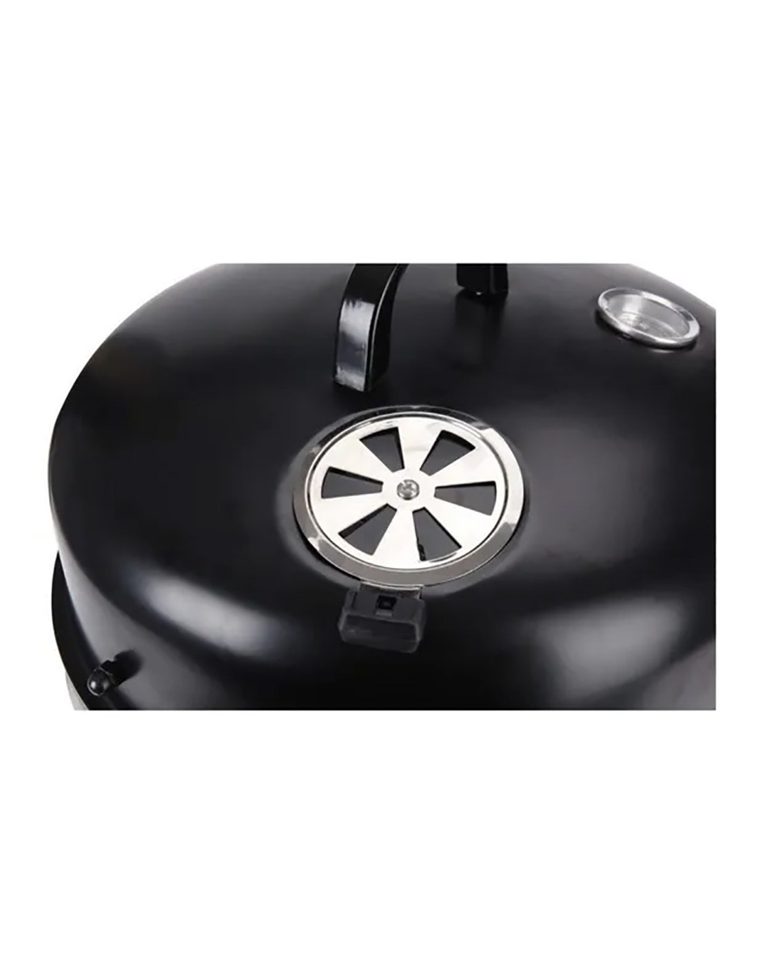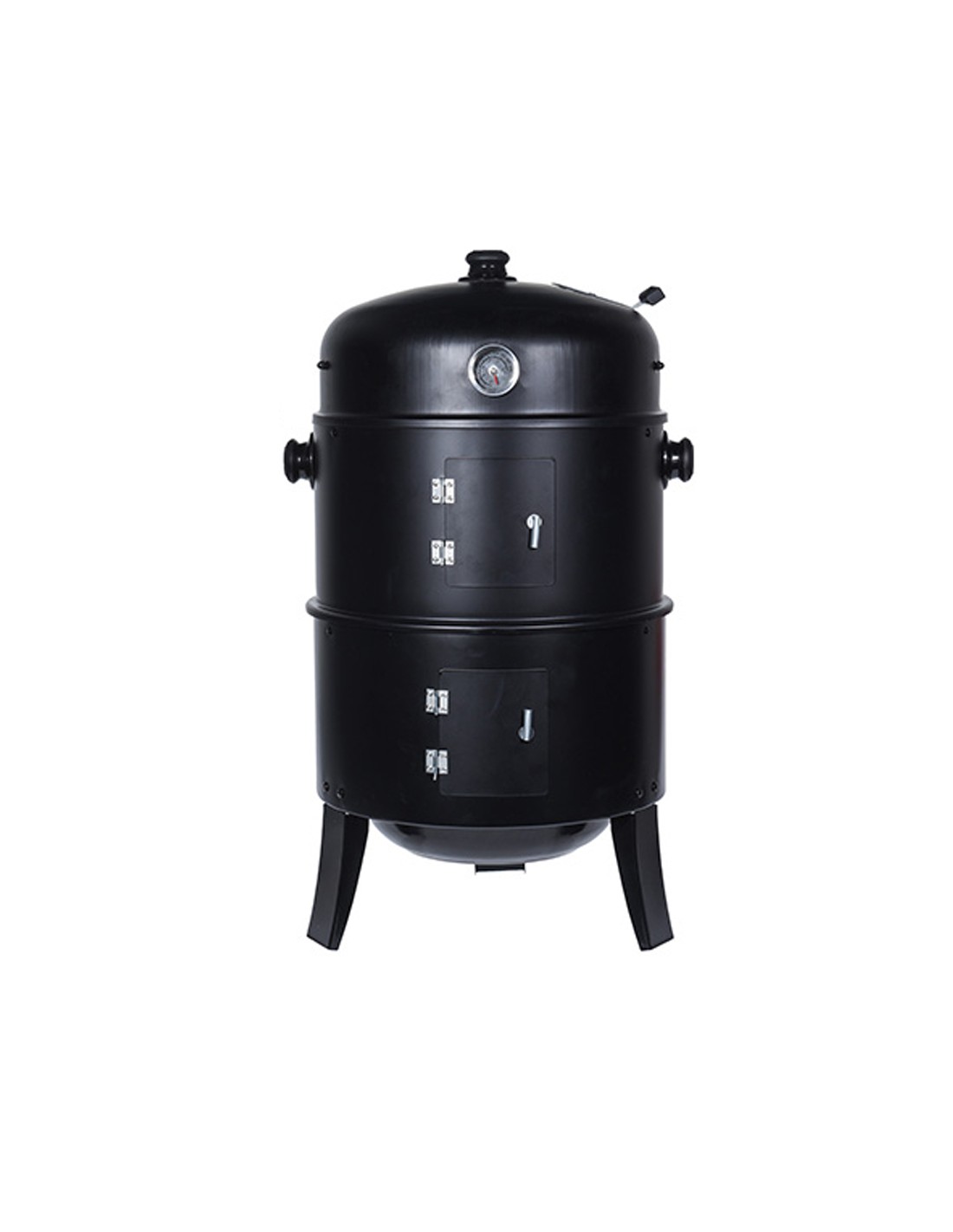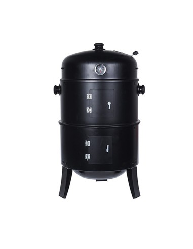 Barbacoa tipo barril para ahumar color negra. con esta barbacoa podras cocinar, asar y ahumar. control de temperatura con la rejilla de ventilación. termometro incluido para una medición precisa. incluye 3 bandejas interiores para poder cocinar o ahumar. se puede cocinar a la parrilla sin tapa. equipado con sumidero de carbón. diametro total 47cm. diámetro de parrilla: aprox 40cm. altura total con tapa: 78cm. altura sin tapa 60cm. material: acero pintado. color negro. adecuado para el uso con carbón y briquetas. bbq