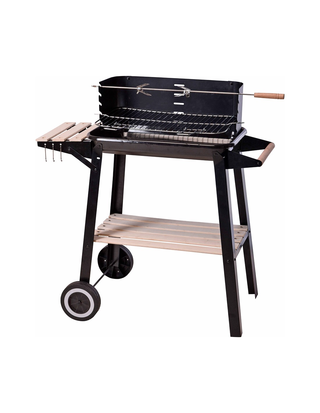 Barbacoa rectangular de carbon 54x34x6.5cm. altura total 86.5cm. parrilla cromada de 48,5x28,5cm. ruedas de polipropileno negro, bandeja de madera natural y varilla cromada de 69cm.