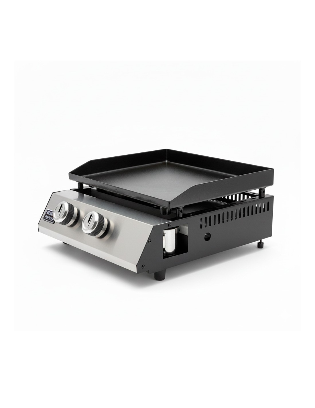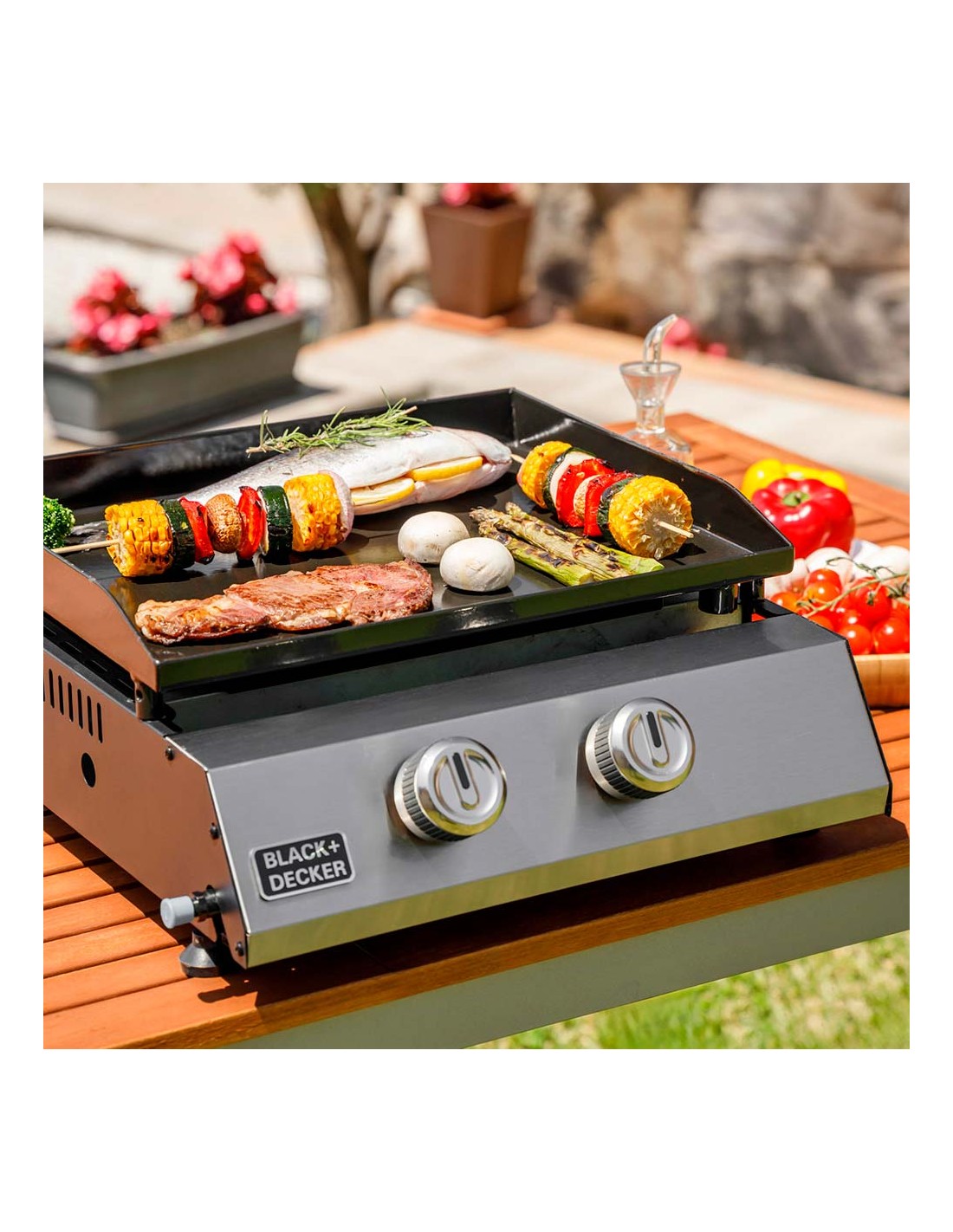 Plancha de gas con 2 quemadores tubulares de acero inoxidable, cada uno con una potencia de 2,45 kw. incorpora encendido automático y un recipiente recoge grasa. superficie de cocción de 580 x 360 mm con recubrimiento de esmalte porcelánico, resistencia a altas temperaturas y una distribución homogénea del calor. panel frontal de acero inoxidable ss 430. patas ajustables que permiten una instalación estable en cualquier superficie. placa de acero de 2,5 mm de grosor. dispone de quemadores regulables