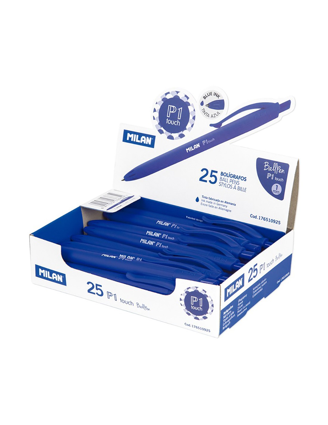 Pack con 25 boligrafos azules milan. caja expositora 25 boligrafos. boligrafo p1 touch azul, con el cuerpo del mismo color que la tinta. longitud de escritura aproximada de 1.200m. punta 1mm. tinta fabricada en alemania. diseño original creado por el departamento de i+d de milan. medidas boligrafo: ø1x14,1x1,7cm