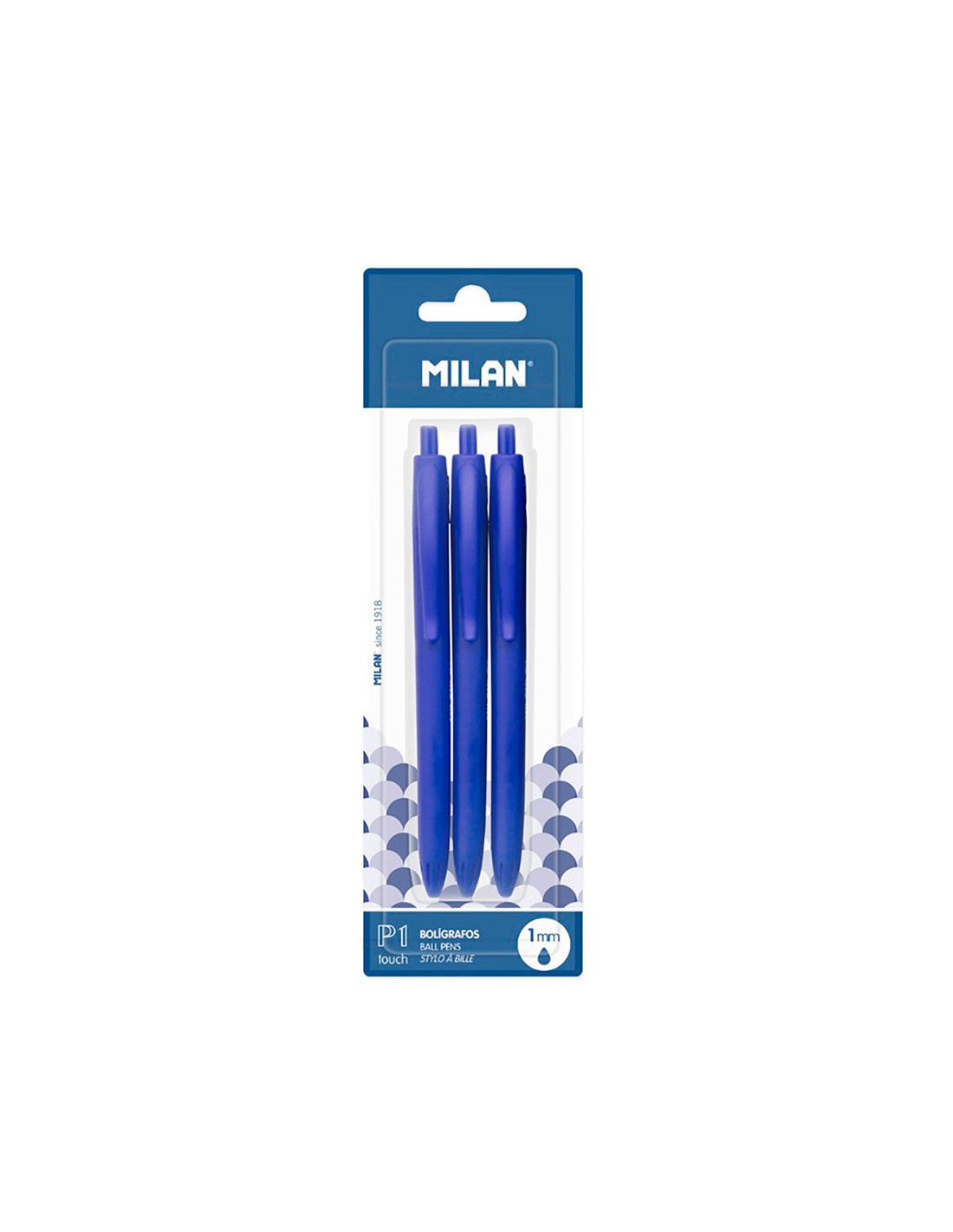 Blister con 3 boligrafos azules milan. 3 boligrafors pi touch azules, con el cuerpo del mismo color que la tinta. longitud de escritura aproximada de 1.200m. punta 1mm. tinta fabricada en alemania. diseño original creado por el departamento de i+d de milan. medidas boligrafo: ø1x14,1x1,7xø1cm