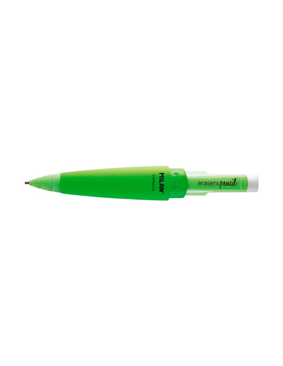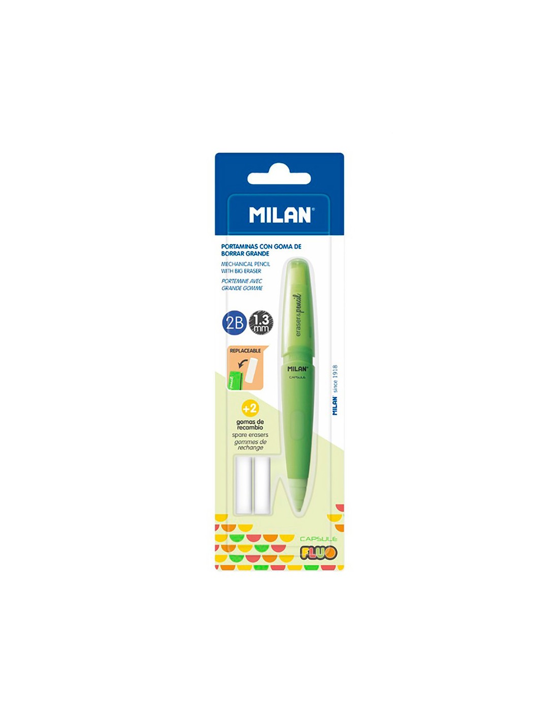 Blister con portaminas capsule fluo + 2 gomas milan. portaminas eraser&pencil capsule fluo. mina de grafito 1.3mm dureza 2b, gruesa y suave, que ofrece un trazo similar a los lápices de madera tradicionales y facilita la escritura a los escolares. goma milan extra-grande. incluye 2 gomas de recambio.disponible en 4 colores fluo: amarillo, naranja, rosa, verde. medidas portaminas capsule: 13x1,8x1,6cm. edición capsule fluor. colores / modelos surtidos