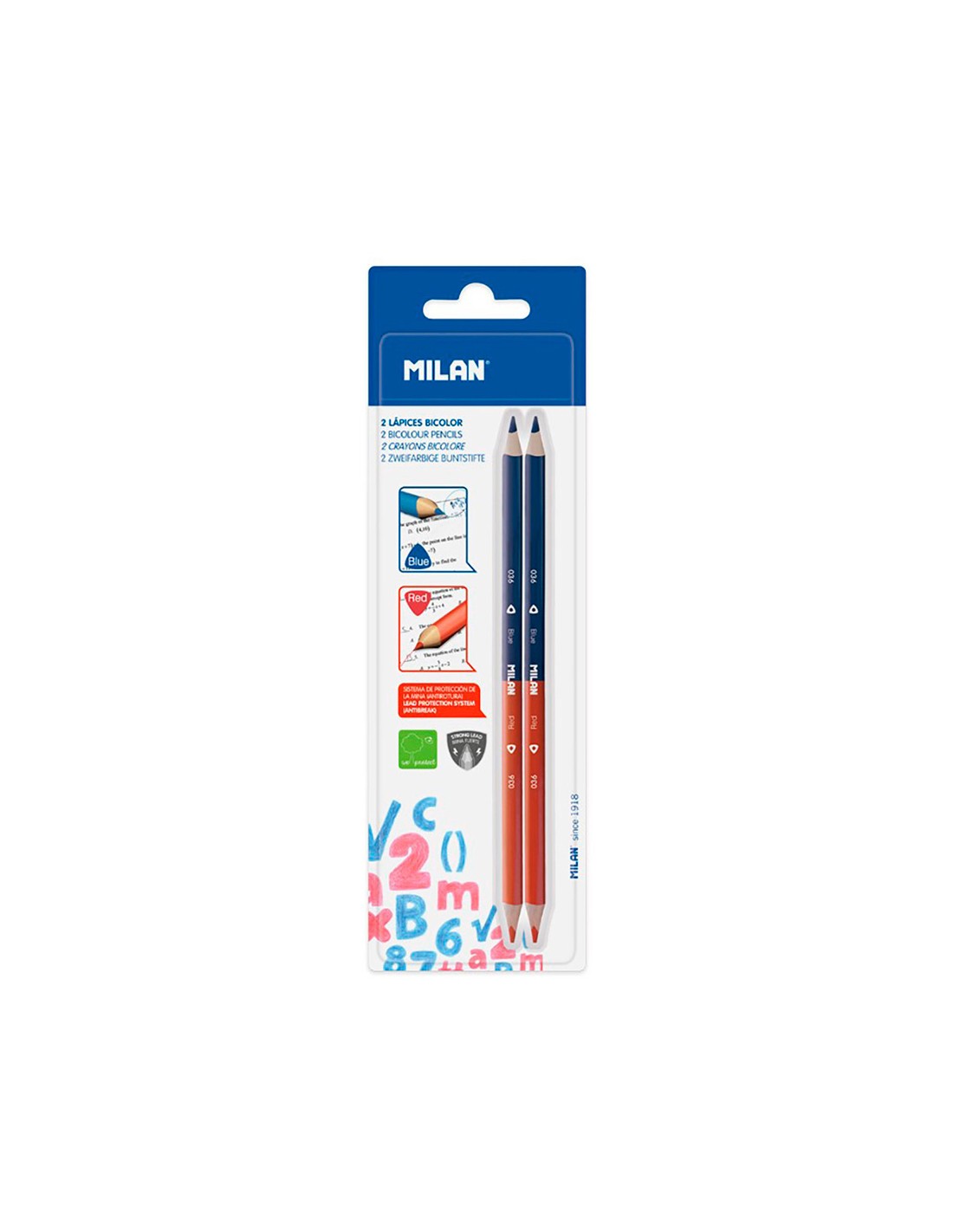 Blister con 2 lapices bicolor milan. lápices bicolor azul - rojo para marcar, revisar, subrayar y escribir. mina de ø2,9mm. forma triangular ergonómica. la mina ofrece un trazo uniforme y es resistente a la rotura, gracias al sistema lps (lead protection system) que protege la mina gracias a su adhesión con la madera. madera procedente de plantaciones sostenibles.