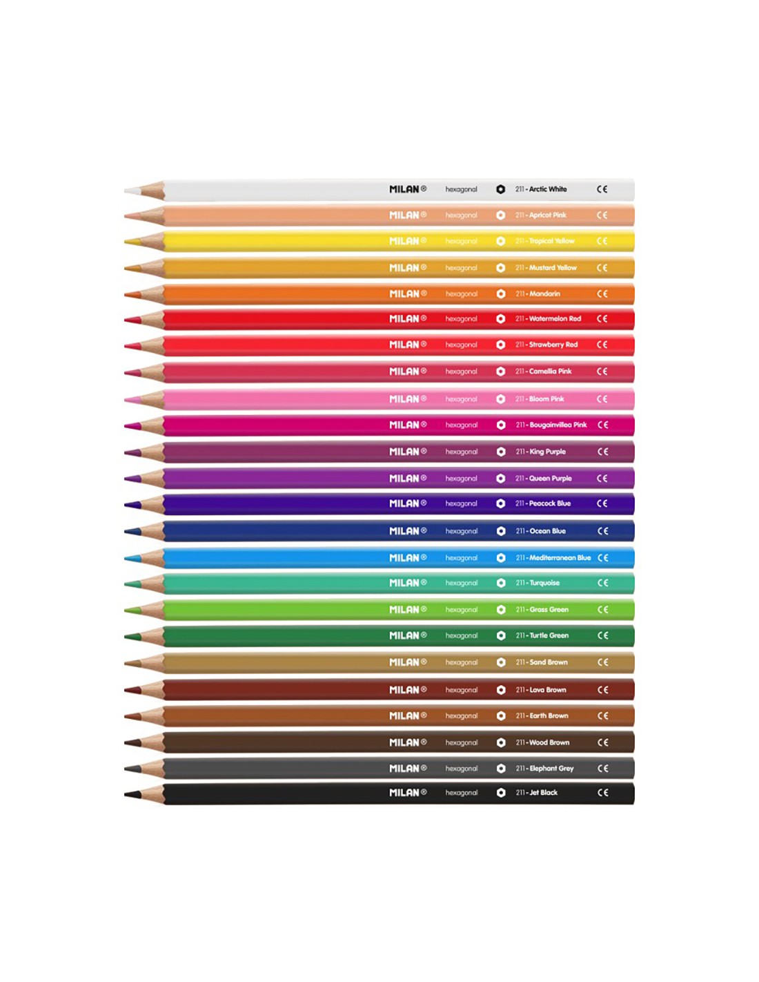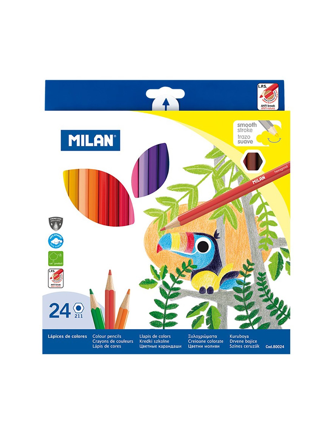 Caja con 24 lápices de colores hexagonales milan. lápices de colores hexagonales. mina de ø2,9mm. la mina ofrece un trazo uniforme y es resistente a la rotura, gracias al sistema lps (lead protection system) que protege la mina gracias a su adhesión con la madera. madera procedente de plantacionessostenibles. 24 colores. cada color cuenta con un nombre propio. incluye bandeja interior.