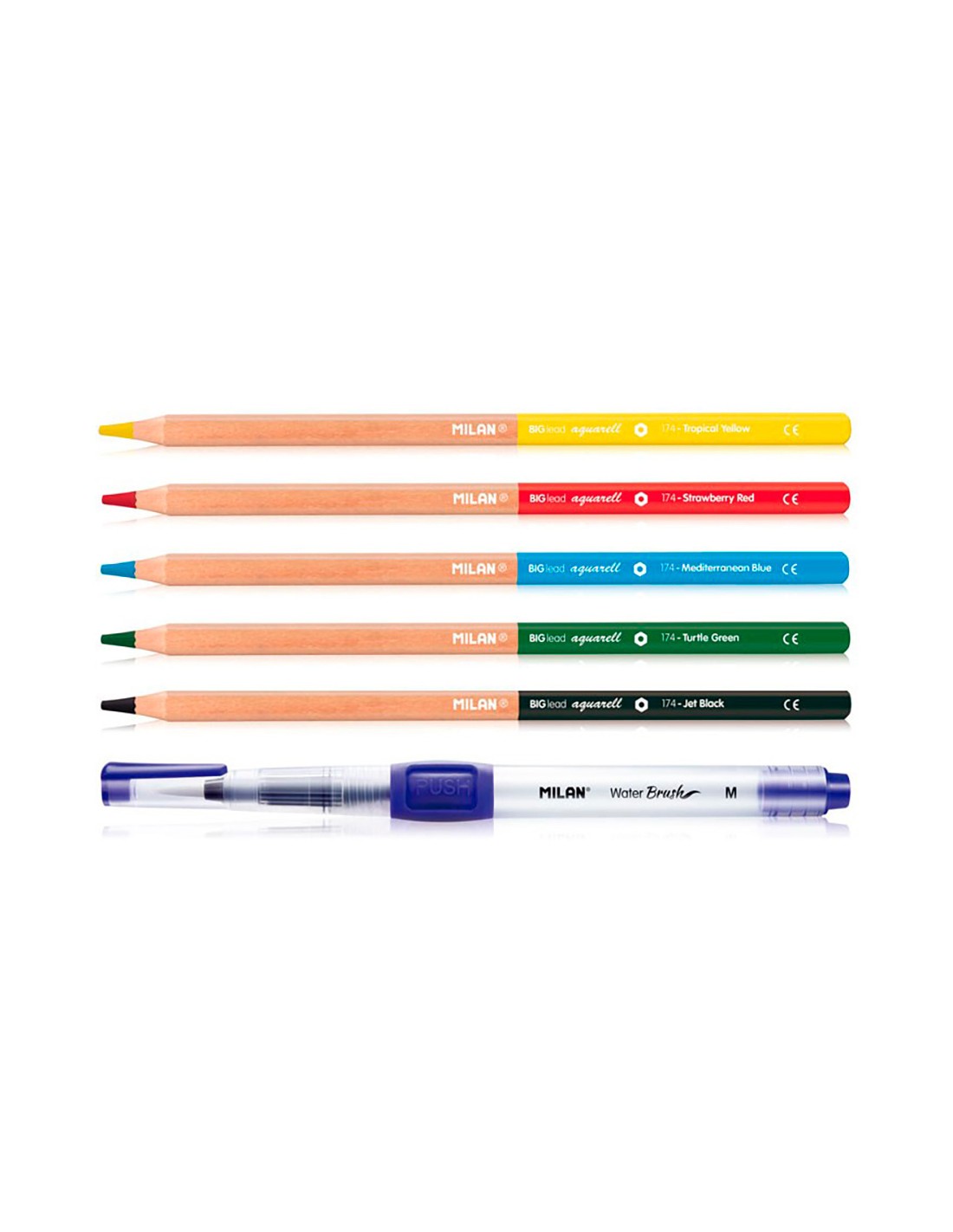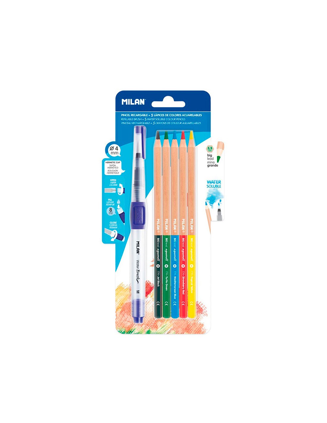 Blister con 1 pincel recargable water brush + 5 lapices acuarelas milan. pincel con depósito recargable de 8ml para agua. adecuado para pintar con lápices acuarelables, pastillas de acuarela, tintas o técnicas que requieran aguada. pincel sintético redondo de ø4mm. tapón hermético. pulsador para regular la cantidad de líquido. 5 lápices de colores acuarelables de mina gruesa de ø3,5mm.