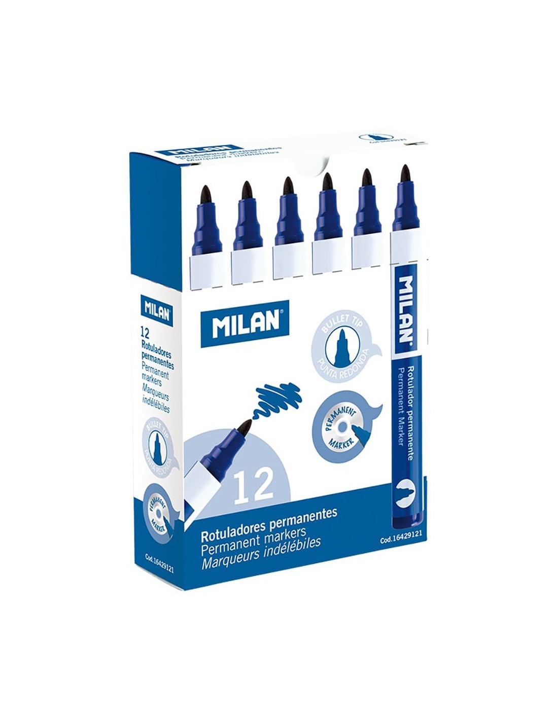Pack con 2 rotuladores azules permantenes. punta redonda milan. rotuladores permanentes color azul marino. rotulador permanente sobre la mayoría de materiales. tinta a base de alcohol. punta redonda ø4mm. recomendamos tapar después de usar y almacenar en posición horizontal.
