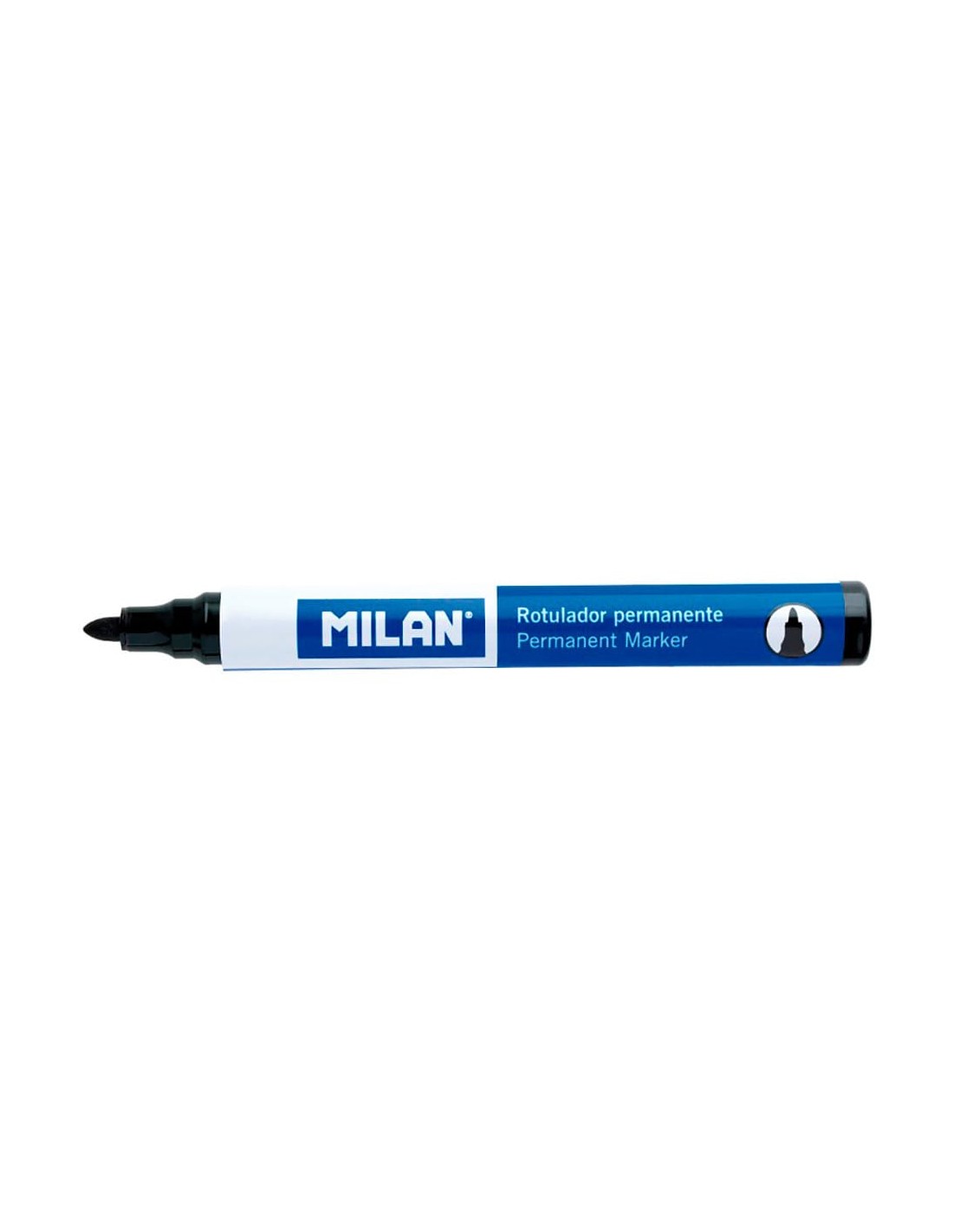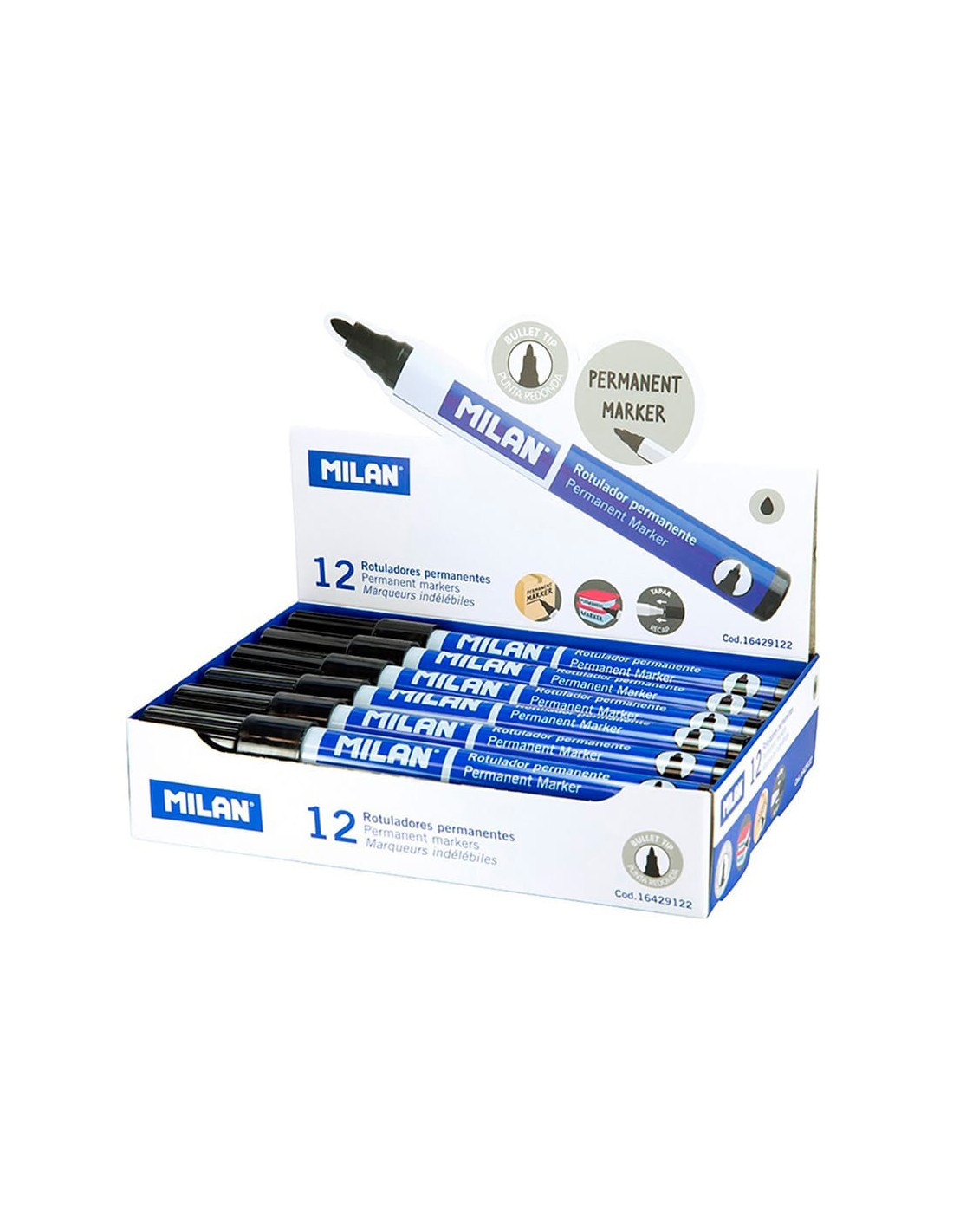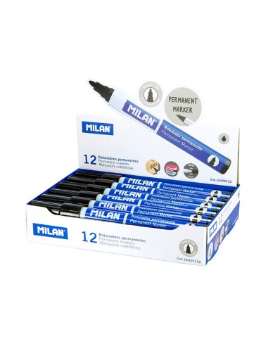 Pack con 12 rotuladores negros permanentes. punta redonda milan. rotuladores permanentes color negro. rotulador permanente sobre la mayoría de materiales. tinta a base de alcohol. punta redonda ø4mm. recomendamos tapar después de usar y almacenar en posición horizontal.