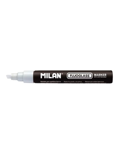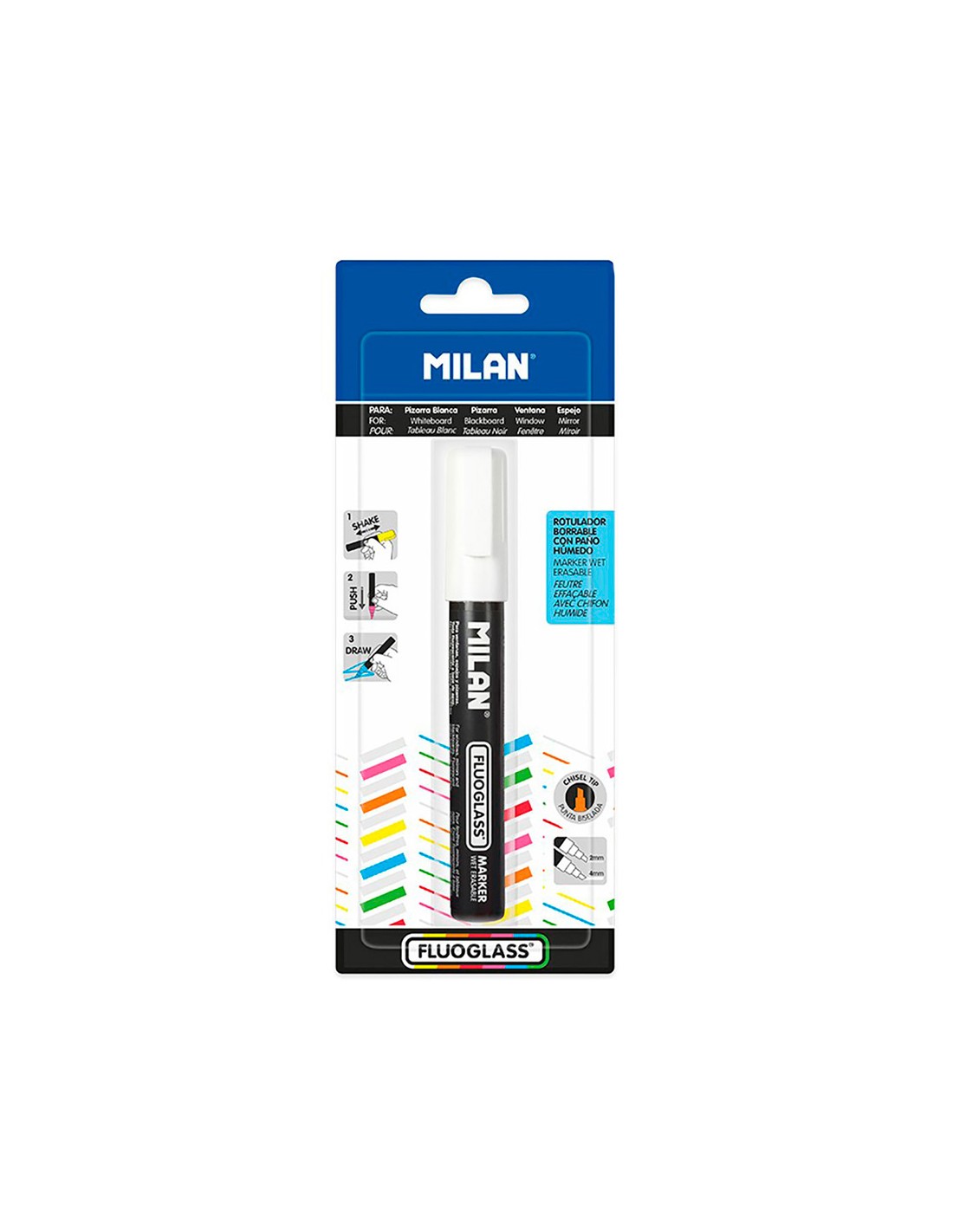 Blister con rotulador blanco fluoglass 2-4mm milan. rotuladores para superficies lisas no porosas (ventanas, espejos, pizarras, etc.). punta biselada 2 - 4mm. tinta a base de agua, fácilmente borrable con la ayuda de un paño húmedo. gracias a la alta concentración de pigmentos los colores se mantienen intensos y brillantes. color blanco.