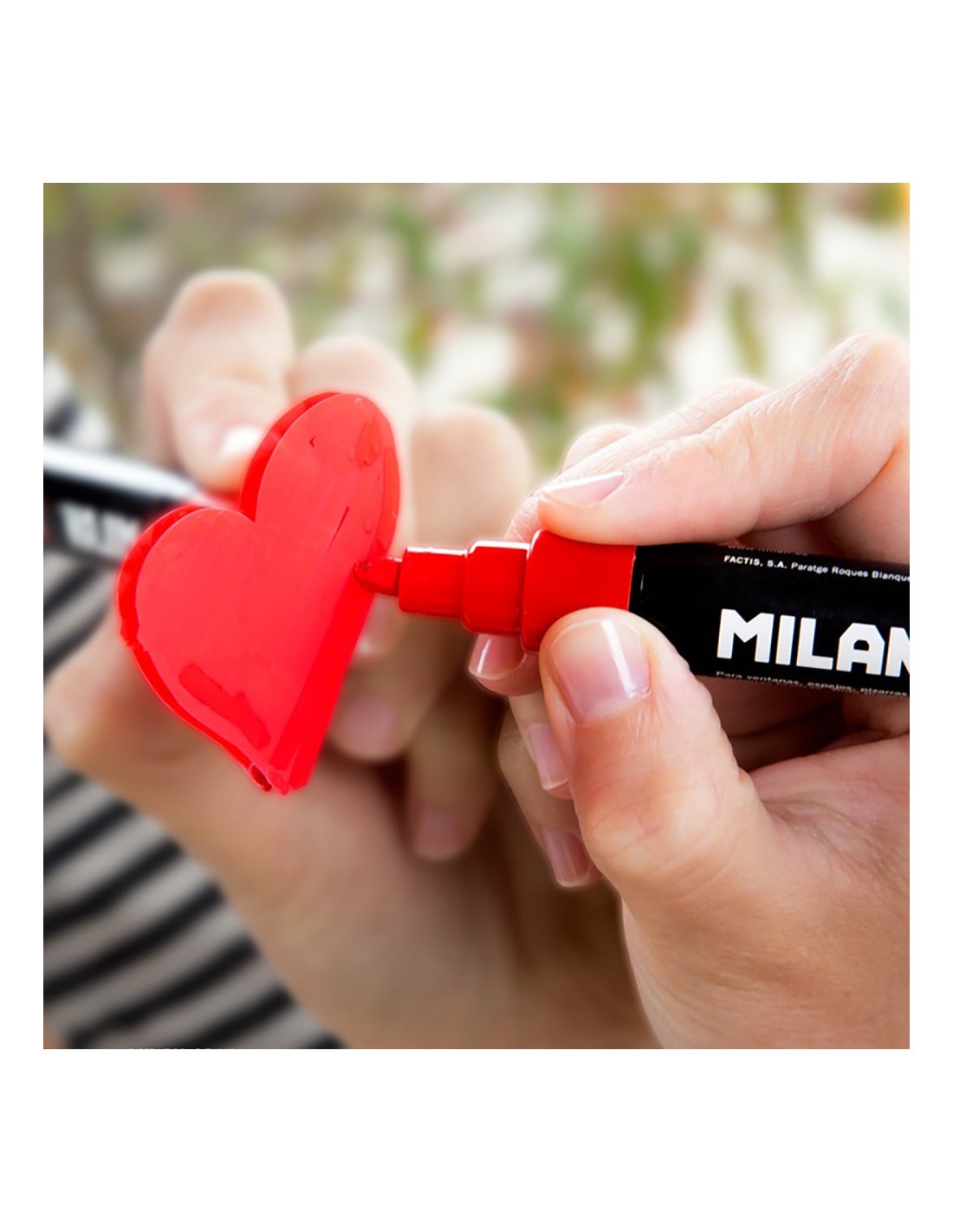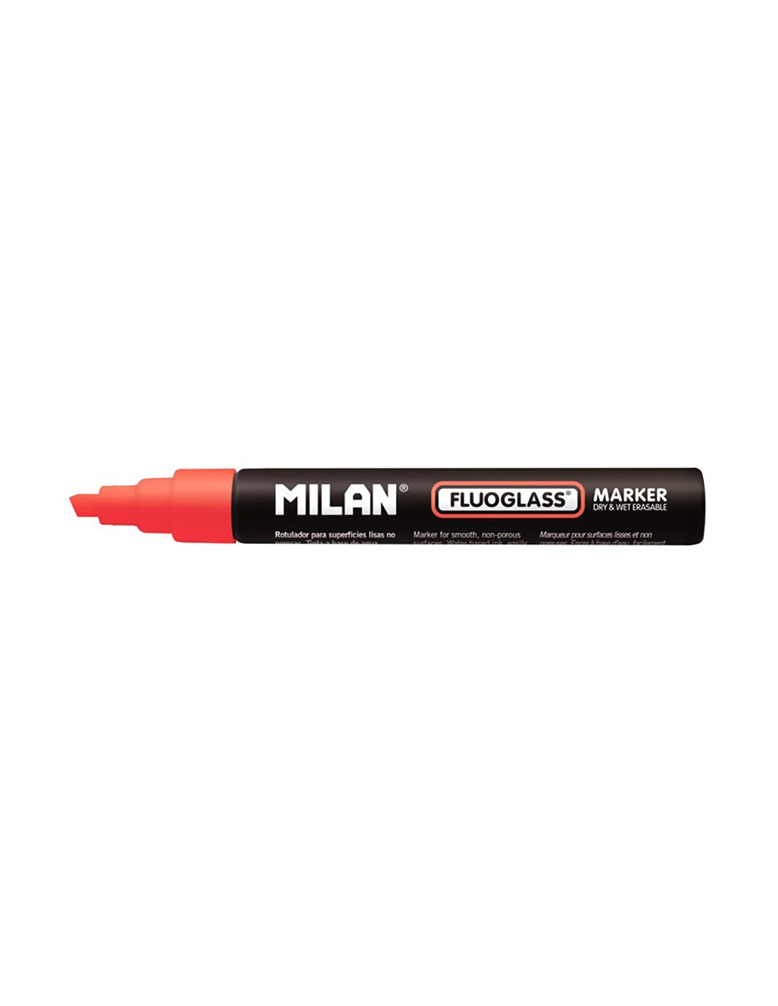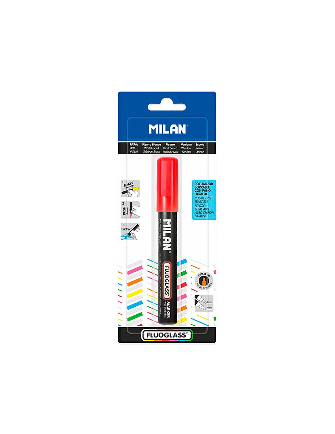 Blister con rotulador rojo fluoglass 2 - 4mm milan. rotuladores para superficies lisas no porosas (ventanas, espejos, pizarras, etc.). punta biselada 2 - 4mm. tinta a base de agua, fácilmente borrable con la ayuda de un paño húmedo. gracias a la alta concentración de pigmentos los colores se mantienen intensos y brillantes. color rojo.