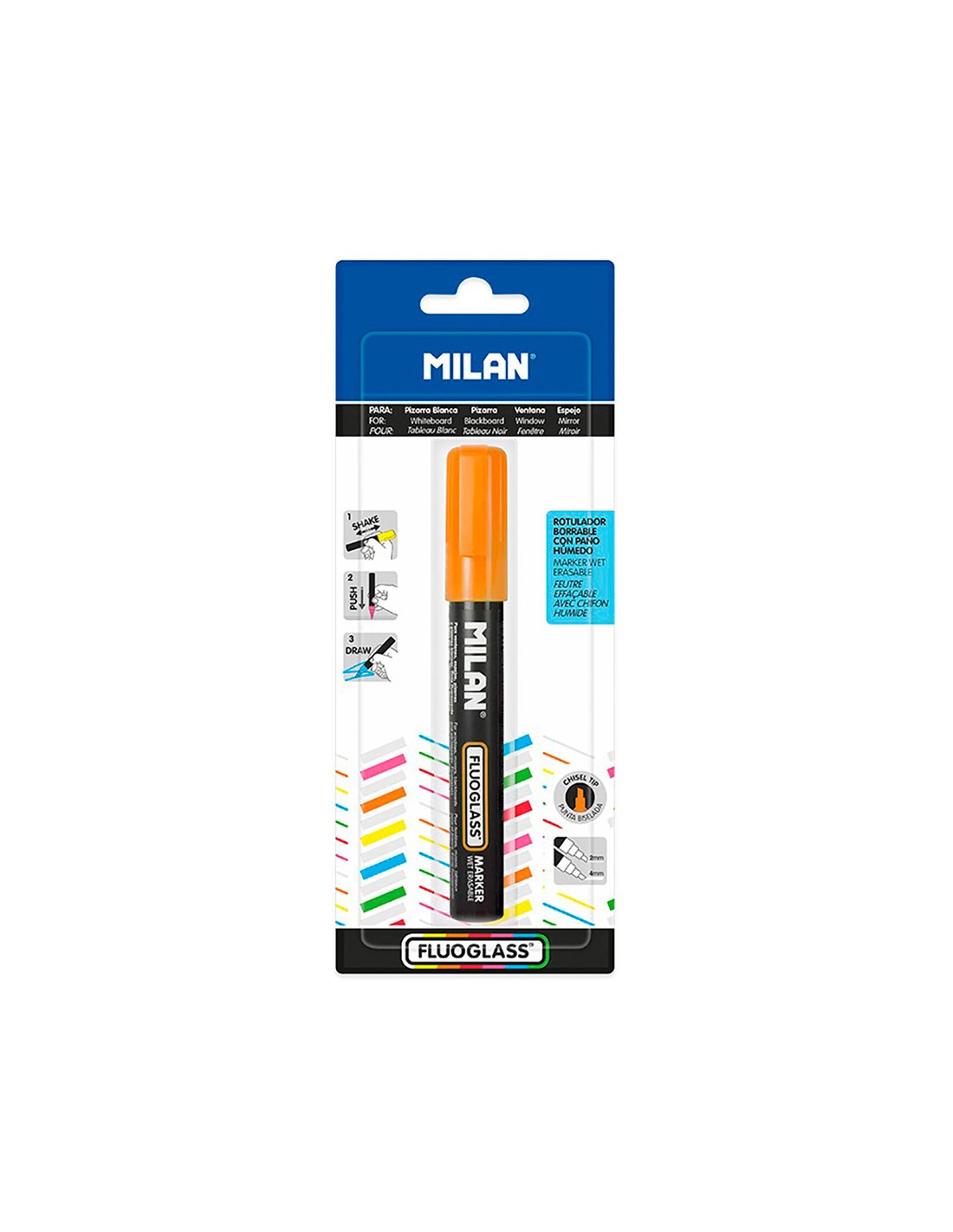 Blister con rotulador naranja fluoglass 2 - 4mm milan. rotuladores para superficies lisas no porosas (ventanas, espejos, pizarras, etc.). punta biselada 2 - 4 mm. tinta a base de agua, fácilmente borrable con la ayuda de un paño húmedo. gracias a la alta concentración de pigmentos los colores se mantienen intensos y brillantes. color naranja.