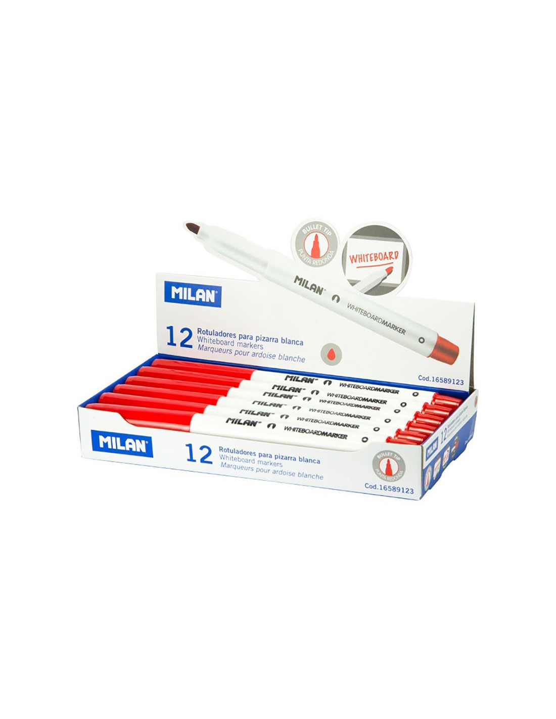 Caja de 12 rotuladores rojos para pizarra blanca milan. rotuladores para pizarra blanca, color rojo. borrable en seco. tinta a base de alcohol. punta redonda ø3,7mm. recomendamos tapar después de usar y almacenar en posición horizontal. rotuladores de recambio para el borrador magnético ref: 16589123
