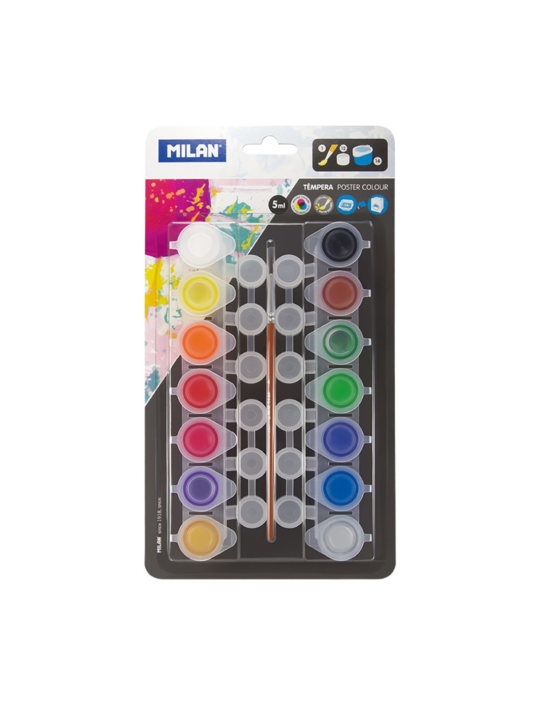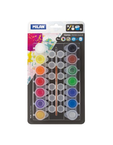 Blister con 14 botes de tempera 5ml + 12 botes de mezclas y pincel milan. 14 tarros de 5ml, colores surtidos. incluye 12 botes mezcladores y un pincel de la serie 101, indicado para témpera. témpera fabricada con pigmentos de calidad y resistentes a la luz. de secado rápido. la pintura tiene una viscosidad y poder cubriente excelentes. está lista para usar y ofrece un óptimo rendimiento. los colores son vivos y puros gracias a su composición. se pueden mezclar para crear nuevos tonos y diluirse en agua para conseguir tonos más ligeros y un acabado acuoso.