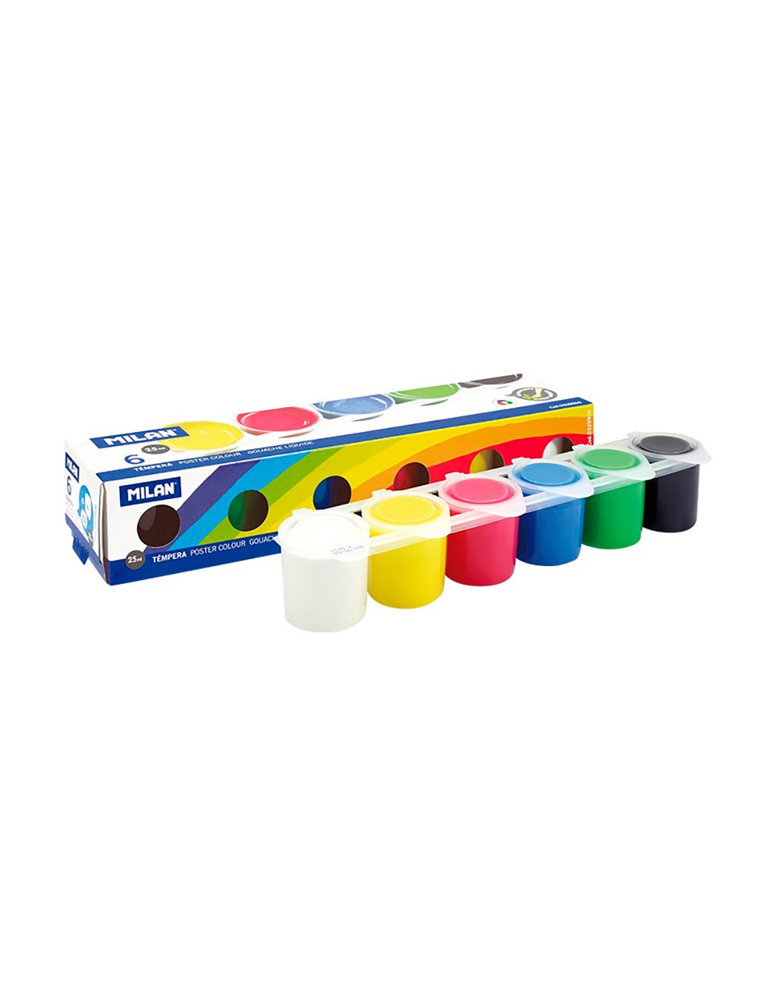 Estuche tempera 25ml con 6 colores milan. 6 tarros de 25ml, colores surtidos: amarillo, azul, blanco, negro, rojo, verde. incluye un pincel escolar de la serie 101, indicado para témpera. témpera fabricada con pigmentos de calidad y resistentes a la luz. los colores son vivos y puros gracias a su composición. sus colores se pueden mezclar para crear nuevos tonos. la pintura tiene una viscosidad y poder cubriente excelentes. está lista para usar y ofrece un óptimo rendimiento. puede diluirse en agua para conseguir tonos más ligeros y un acabado acuoso. se seca rápidamente.