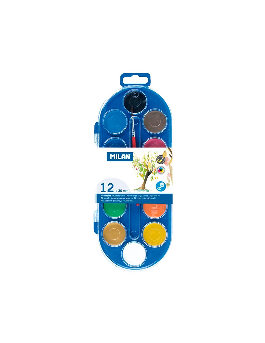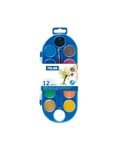 Estuche con 12 pastillas de acuarelas ø30mm + 1 pincel milan. 12 pastillas de distintos colores, ø30mm. incluye un pincel escolar de la serie 101 especialmente indicado para acuarela. los colores se pueden mezclar en los pequeños recipientes mezcladores de la tapa del estuche. las acuarelas milan se presentan en pastillas redondas y compactas. sus colores se obtienen a partir de pigmentos inocuos y resistentes a la luz. pueden lavarse fácilmente sobre la mayoría de tejidos.