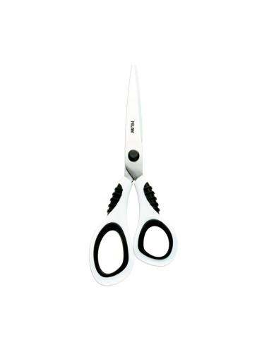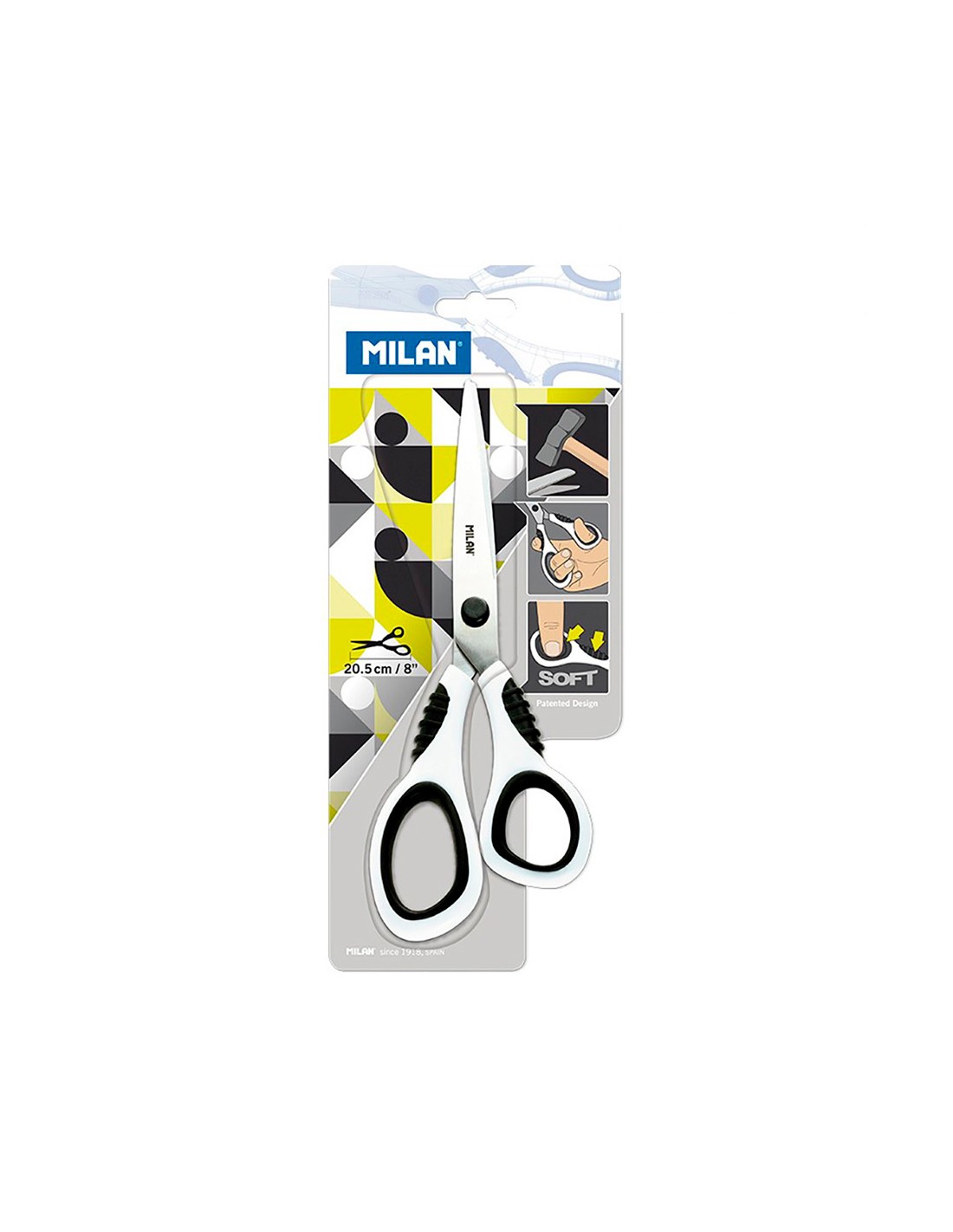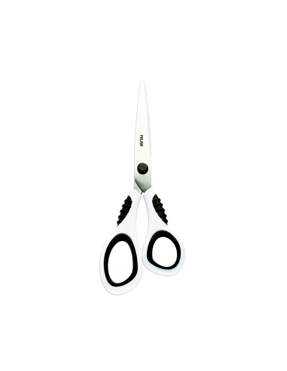 Blister con tijeras de oficina blancas milan. tijeras de oficina con cuchilla de acero inoxidable. mango de plástico blanco con detalles negros, resistente a los golpes y ergonómico. medidas: 20,5cm