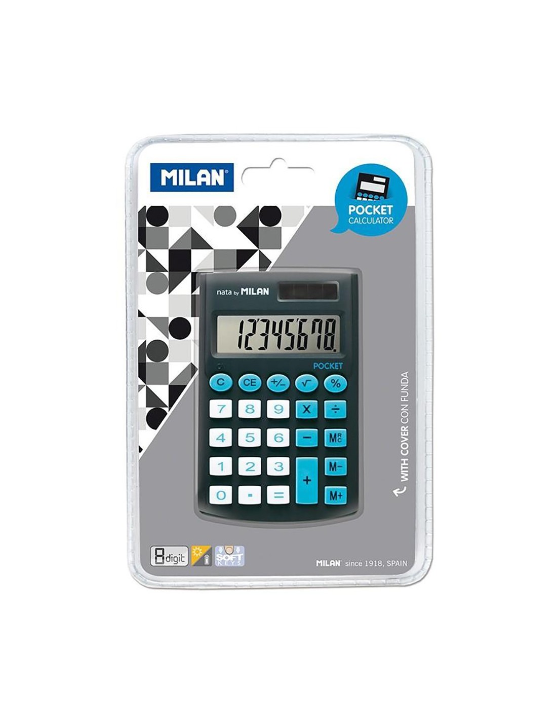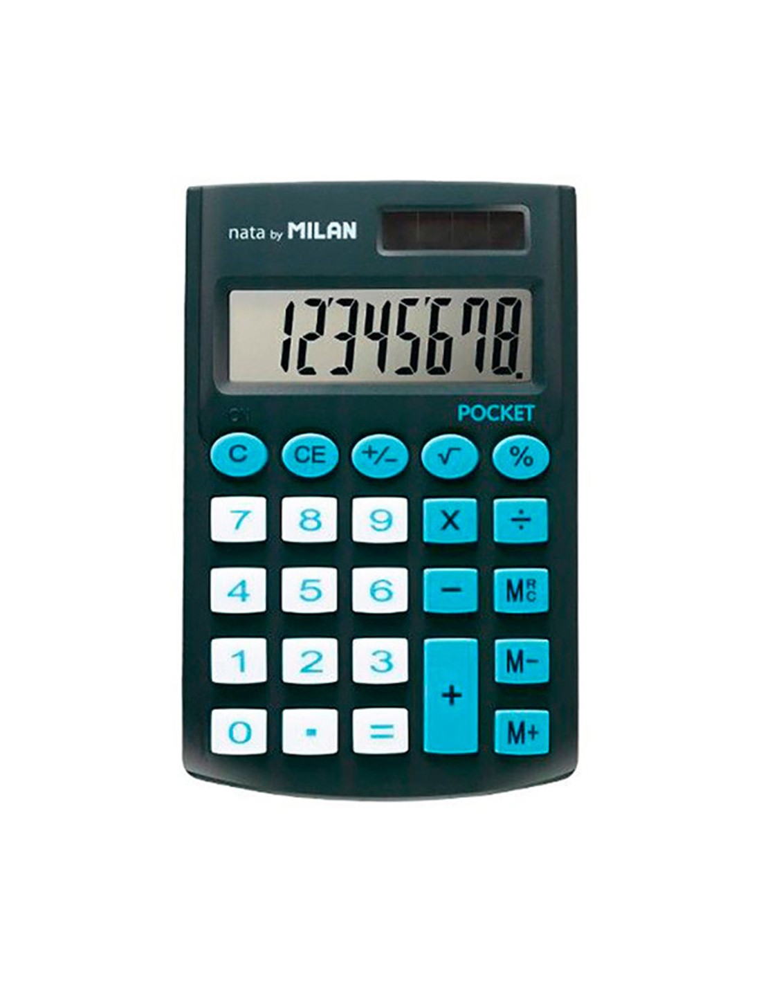 Blister calculadora pocket negra 8 digitos con funda milan. calculadora de bolsillo de 8 dígitos con funda. teclas con tacto suave.3 teclas de memoria y raíz cuadrada. alimentación dual: célula solar y pila de 1,5 v. apagado automático. medidas calculadora: 9,7 x 6,2 x 0,8 cm.