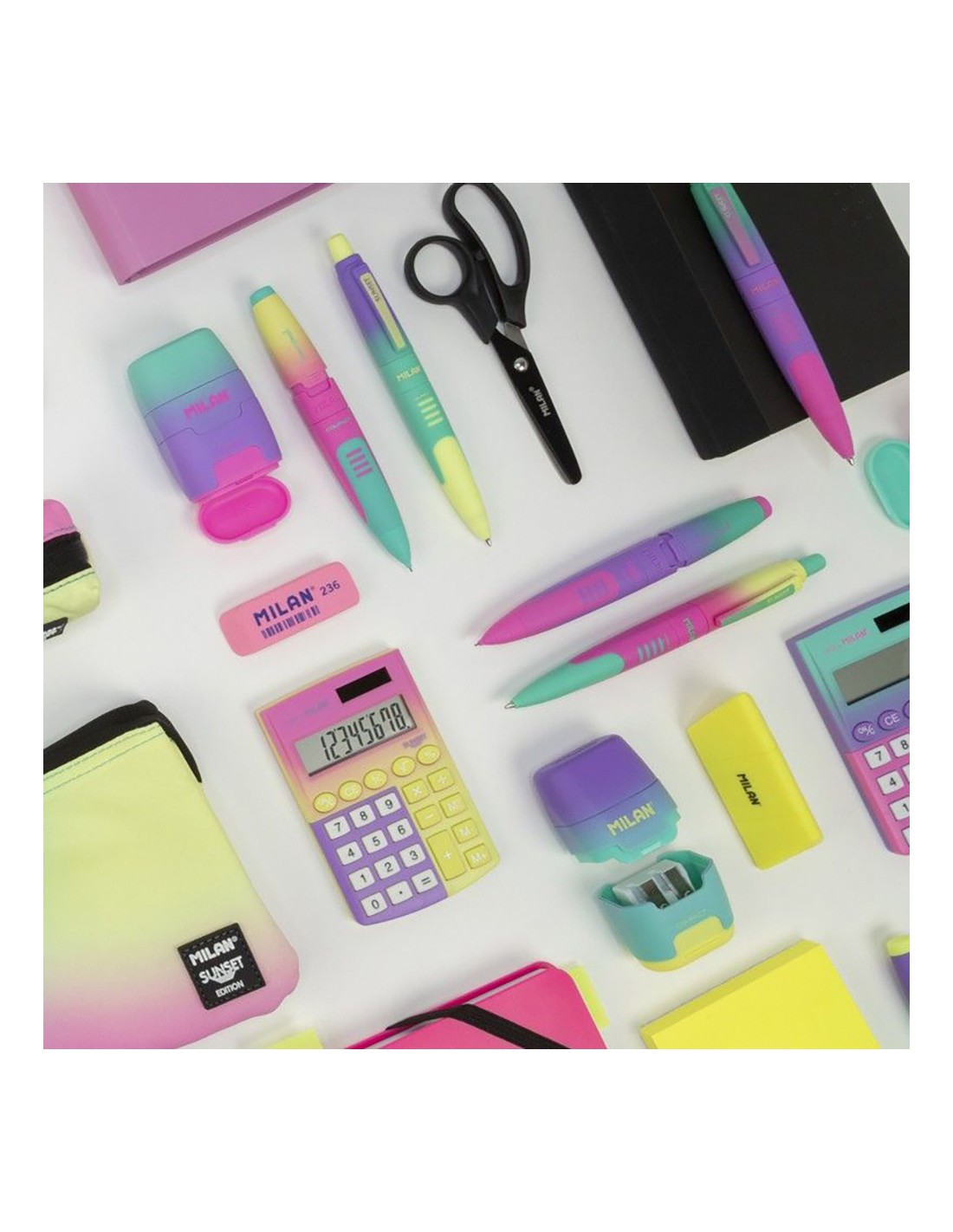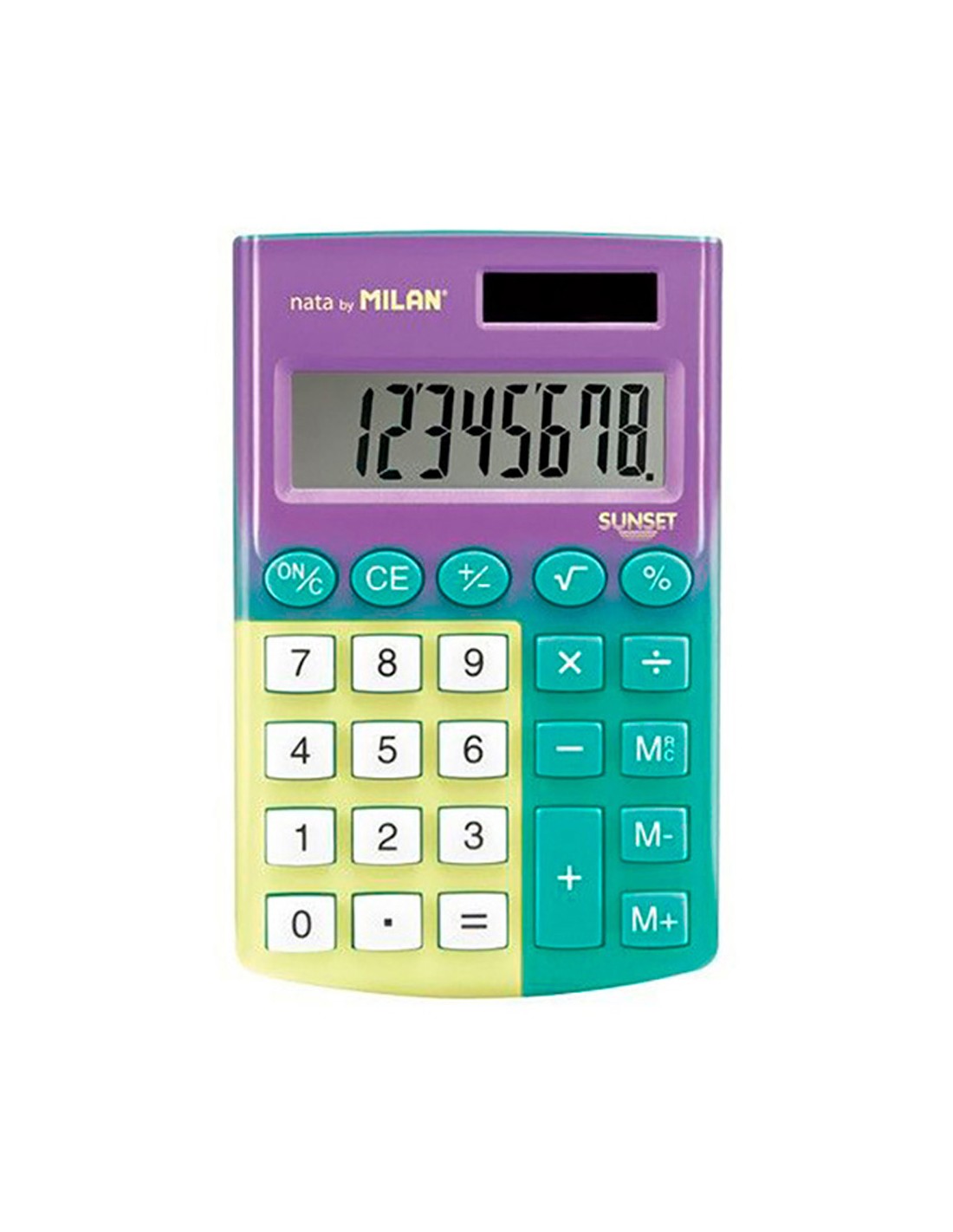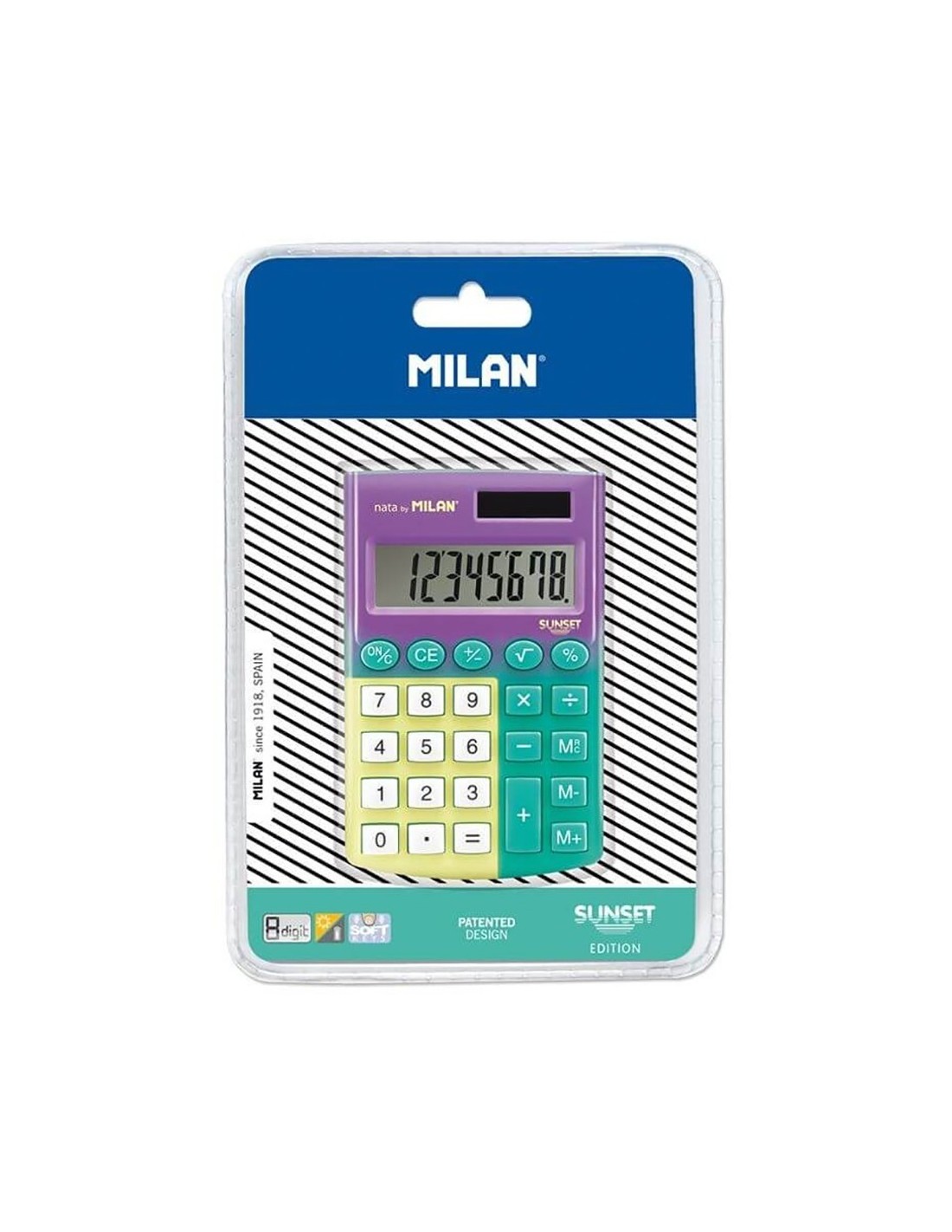 Blister calculadora pocket sunset 8 digitos milan. calculadora de bolsillo de 8 dígitos edición sunset. teclas con tacto suave. 3 teclas de memoria y raíz cuadrada. alimentación dual: célula solar y pila de 1,5 v. apagado automático. colores: amarillo, lila y turquesa. medidas calculadora: 9,7 x 6,2 x 0,8 cm