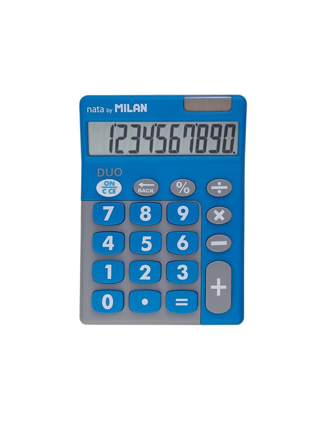 Blister calculadora duo 10 digitos azul teclas grandes milan. calculadora de sobremesa de 10 dígitos y teclas grandes. tecla de rectificación de entrada de datos. alimentación dual: célula solar y pila de 1,5v. apagado automático. medidas calculadora: 14,5x10,6x2,1cm. edición duo.