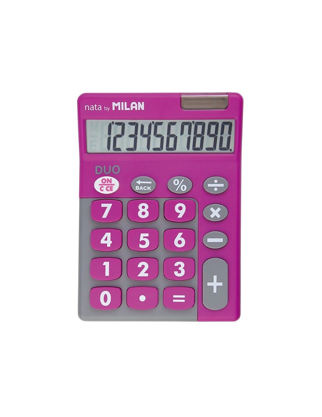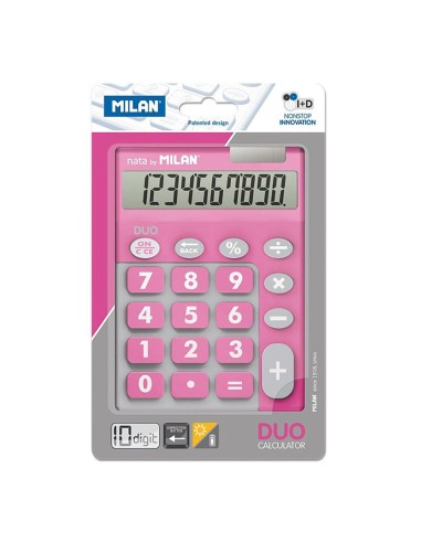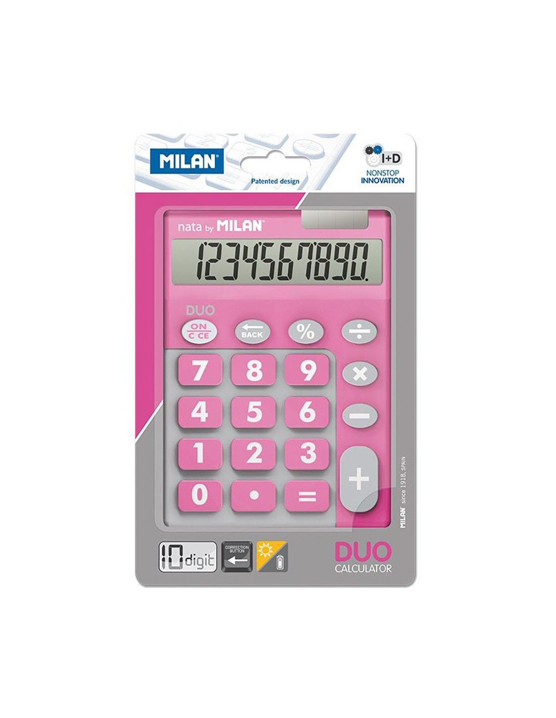 Blister calculadora duo 10 digitos rosa teclas grandes milan. calculadora de sobremesa de 10 dígitos y teclas grandes. tecla de rectificación de entrada de datos. alimentación dual: célula solar y pila de 1,5v. apagado automático. medidas calculadora: 14,5x10,6x2,1cm. edición duo.