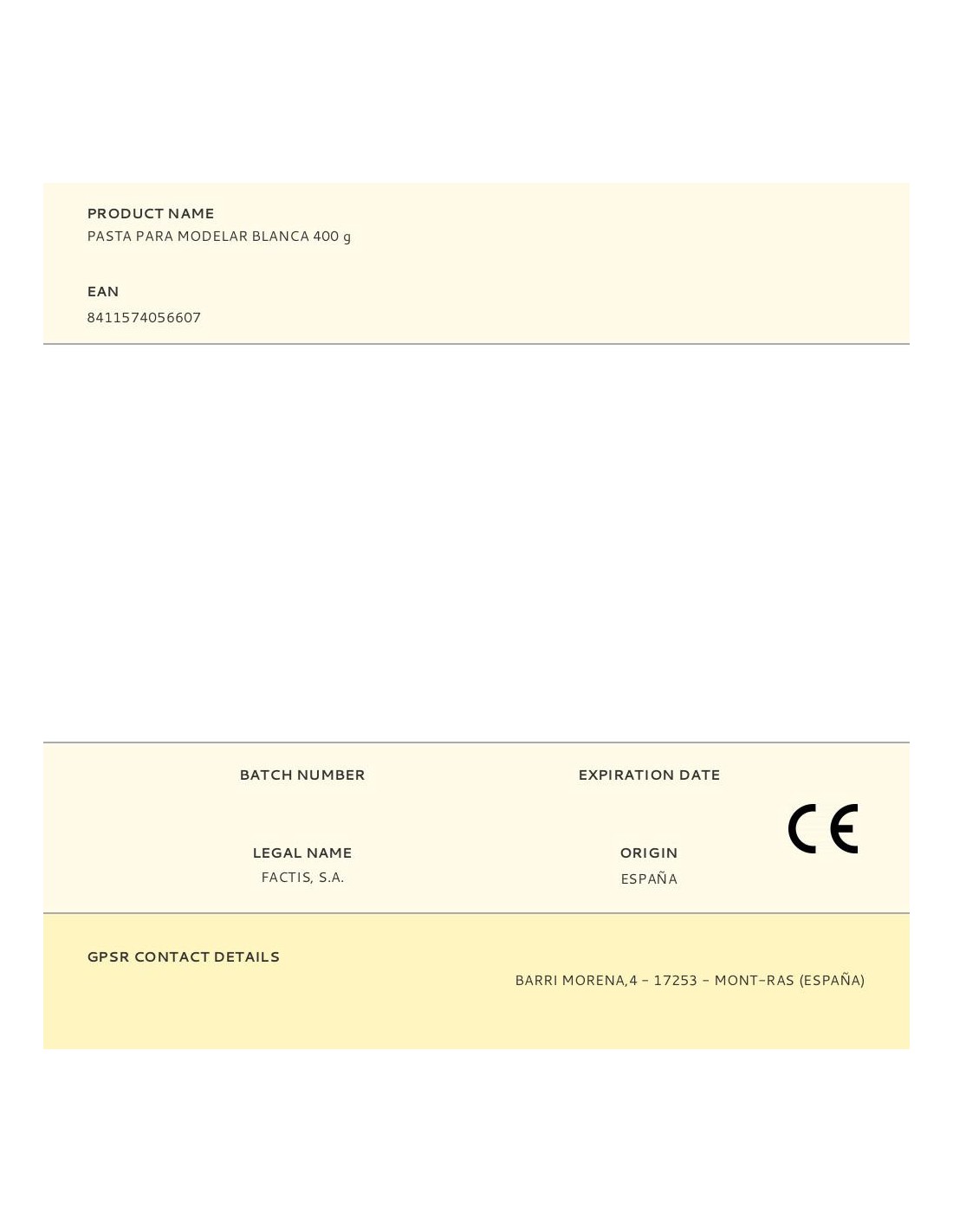 Pasta para modelar blanca 400g milan. la pasta para modelar milan es una mezcla sólida y compacta que al amasarla manualmente se vuelve moldeable, lista para usar. se puede pintar y/o barnizar y está especialmente indicada para manualidades. con la pasta maleable se pueden modelar los componentes de una misma obra por separado, ya que su calidad permite unir las partes (antes de su secado) con facilidad. el tiempo de secado varía según los espesores y condiciones climáticas. piezas de 1cm de grosor quedan secas en 48 horas y ofrece una buena resistencia a la rotura. secado al aire (no debe secarse con aire forzado). peso: 400g.