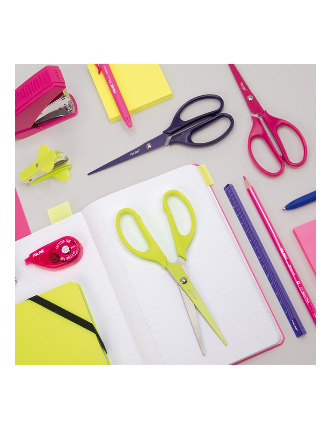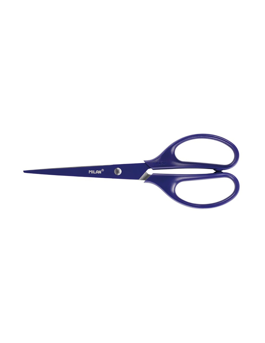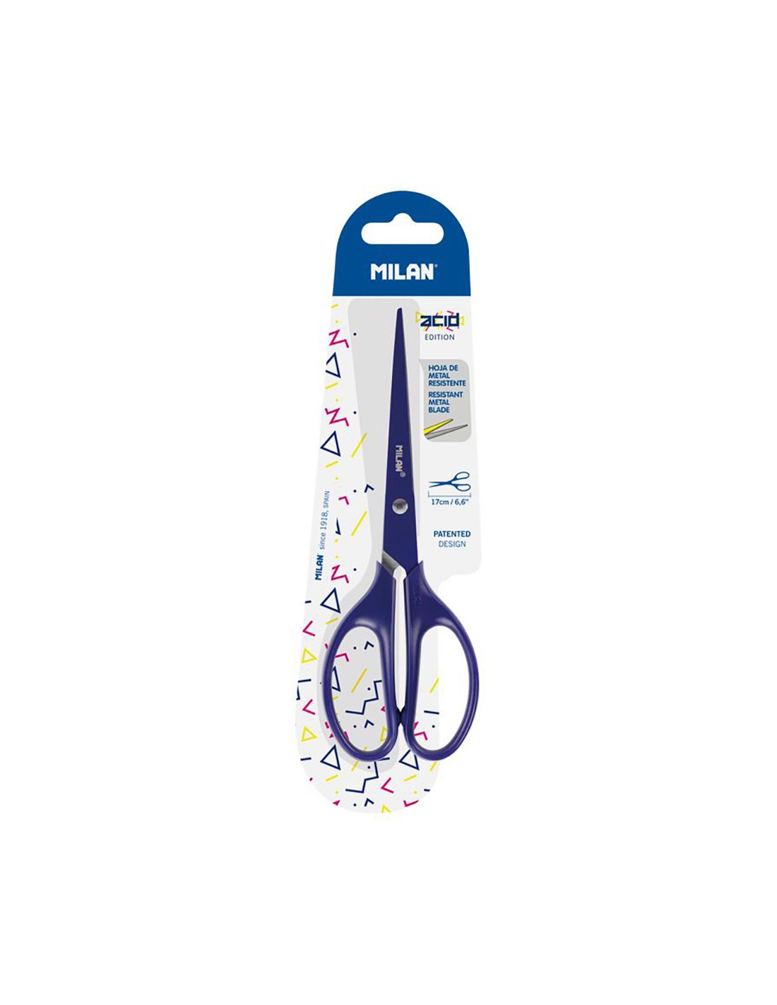 Blister con tijeras de oficina acid azul milan. tijeras de oficina con la hoja del mismo color que la empuñadura. edición acid, color azul. con cuchilla de acero inoxidable resistente, acabada en punta, permite una mayor precisión en el corte. mango de plástico simetrico, apto también para zurdos. medidas: 17cm