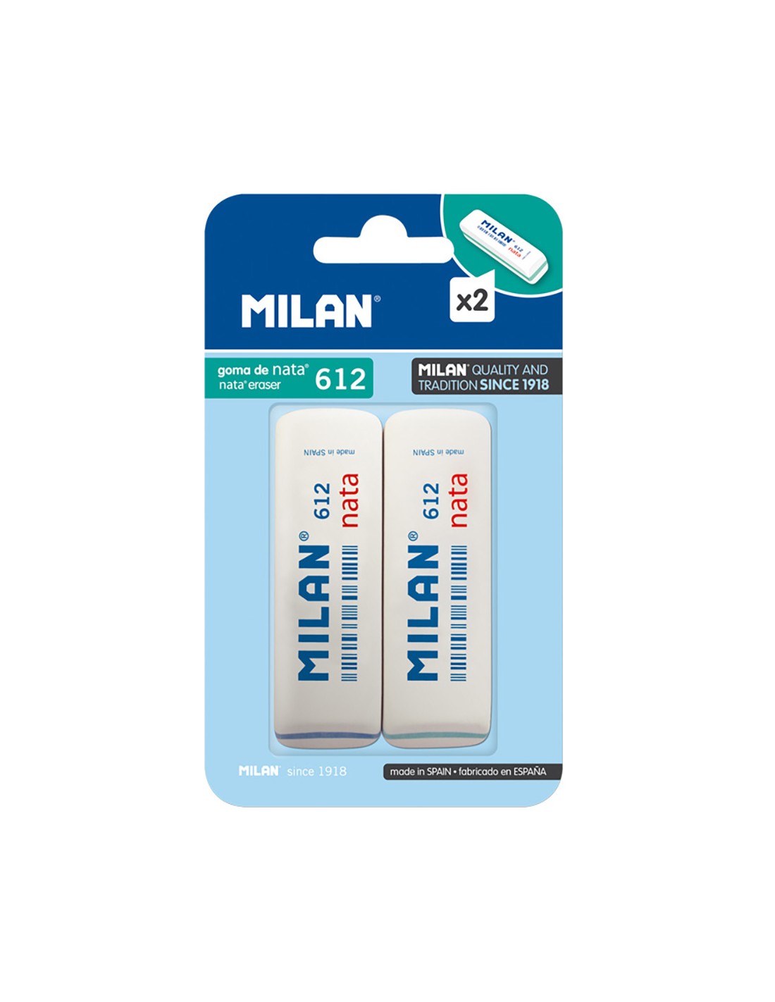 Blister con 2 gomas de borrar de nata 612. goma nata ® de plástici blanca, suave, versátil y no abrasiva. para borrar sobre todo tipo de superficies. no daña el papel. goma biselada blanca con una franja horizontal de color. medidas goma: 7,8x2,3x1,2cm.