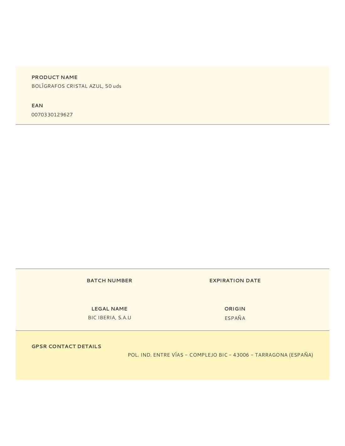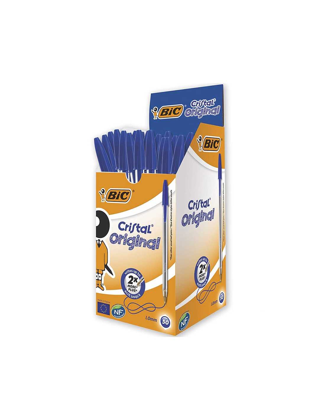 Pack 50 unid. bolígrafos bic cristal azul. capuchón y tapón del color de la tinta. cuerpo transparente que permite ver el nivel de tinta. certificado ecológico nf. garantiza 3km de escritura. punta de 1mm trazo de 0,4mm