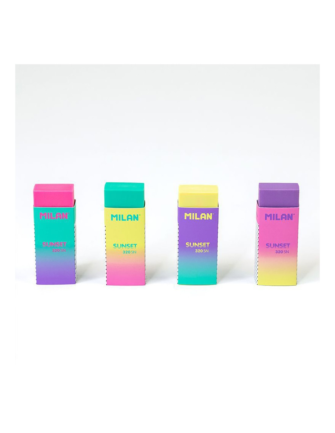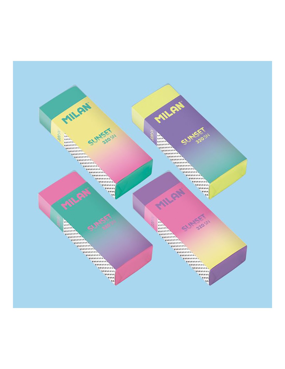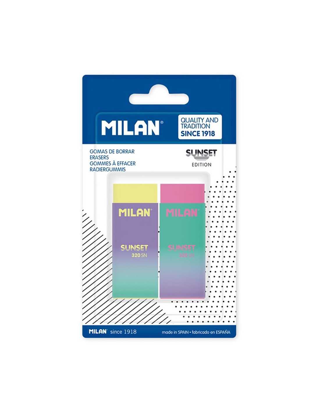 Blister con 2 gomas nata® 320 edición sunset milan. goma de borrar nata® edición sunset. color amarillo y rosa. goma de plástico suave y versátil, no abrasiva. para borrar lápiz sobre todo tipo de superficies. con faja de cartón sunset y envuelta individualmente. medidas: 6,1x2,3x1,2cm.
