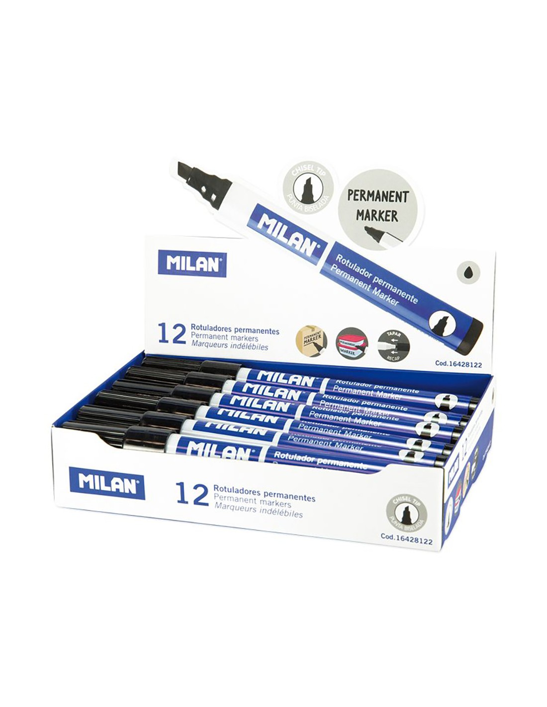 Caja con 12 rotuladores permanentes. punta biselada negro milan. rotuladores permanentes color negro. rotulador permanente sobre la mayoría de materiales. tinta a base de alcohol. punta biselada 1 - 4mm. recomendamos tapar después de usar y almacenar en posición horizontal.