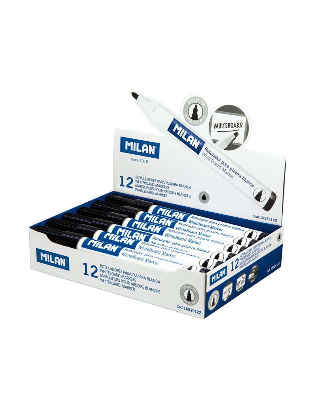 Caja de 12 rotuladores negros para pizarra blanca milan. rotuladores para pizarra blanca, color negro. borrable en seco. tinta a base de alcohol. punta redonda ø4,7mm. recomendamos tapar después de usar y almacenar en posición horizontal. rotuladores de recambio para el borrador magnético ref: 16529122