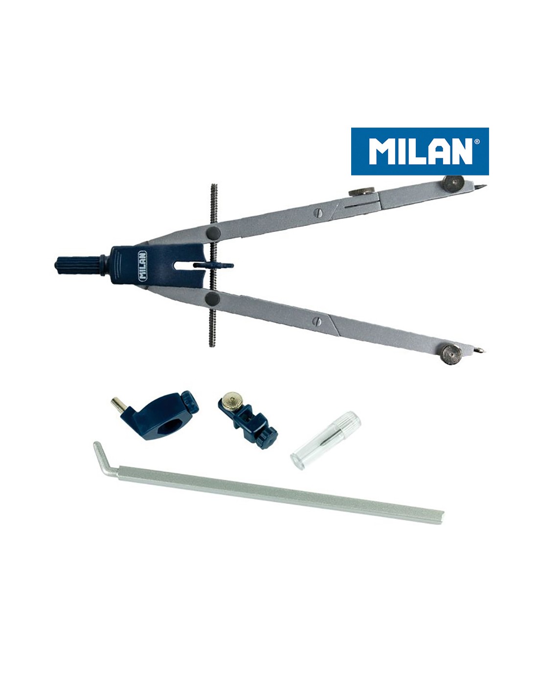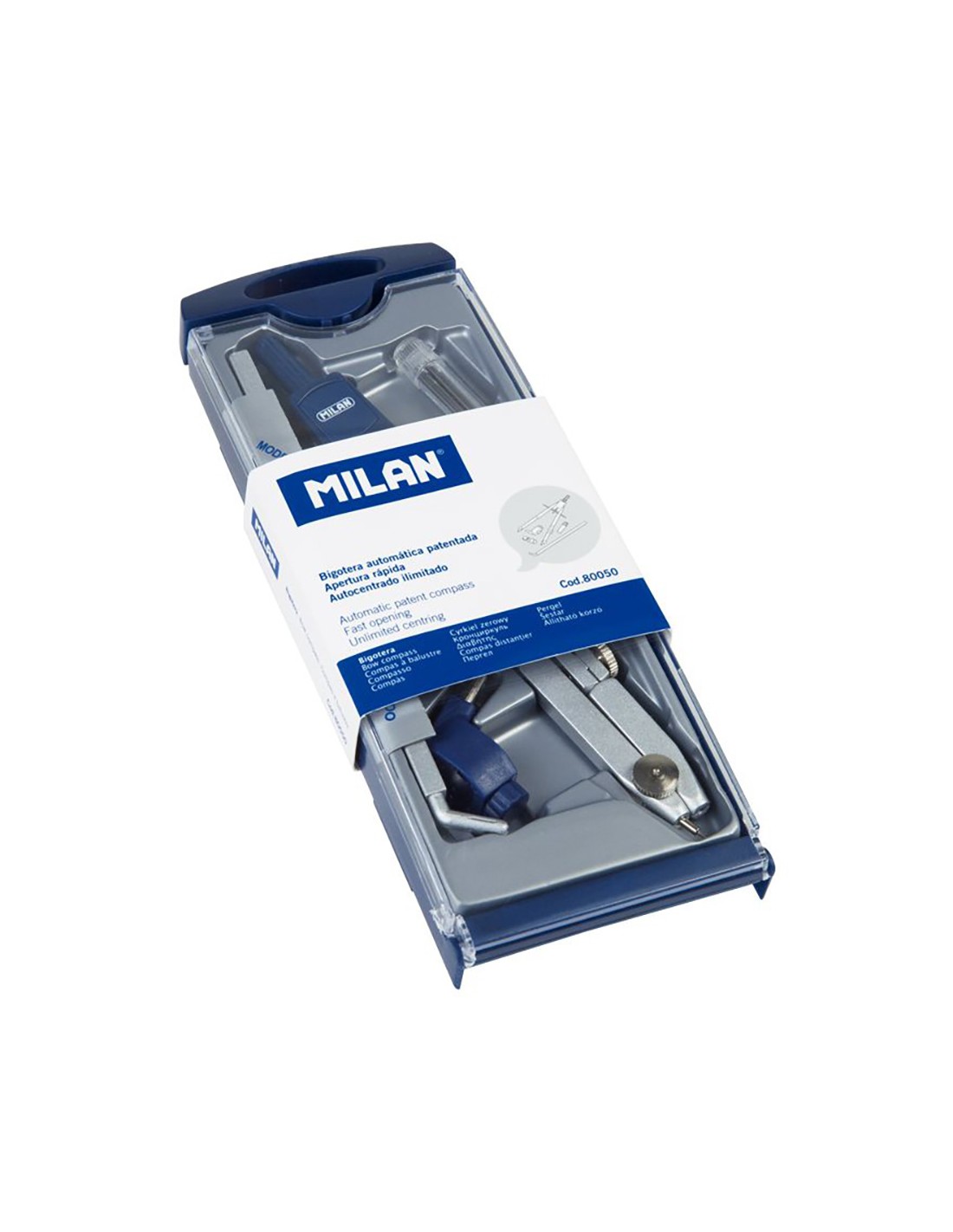 Compás con bigotera automática de apertura rápida milan. bigotera automática de apertura rápida. precisión y calidad constantes. autocentrado ilimitado. contiene minas de recambio, adaptador para rotuladores técnicos y alargadera. ambas patas articuladas. 12cm de largo