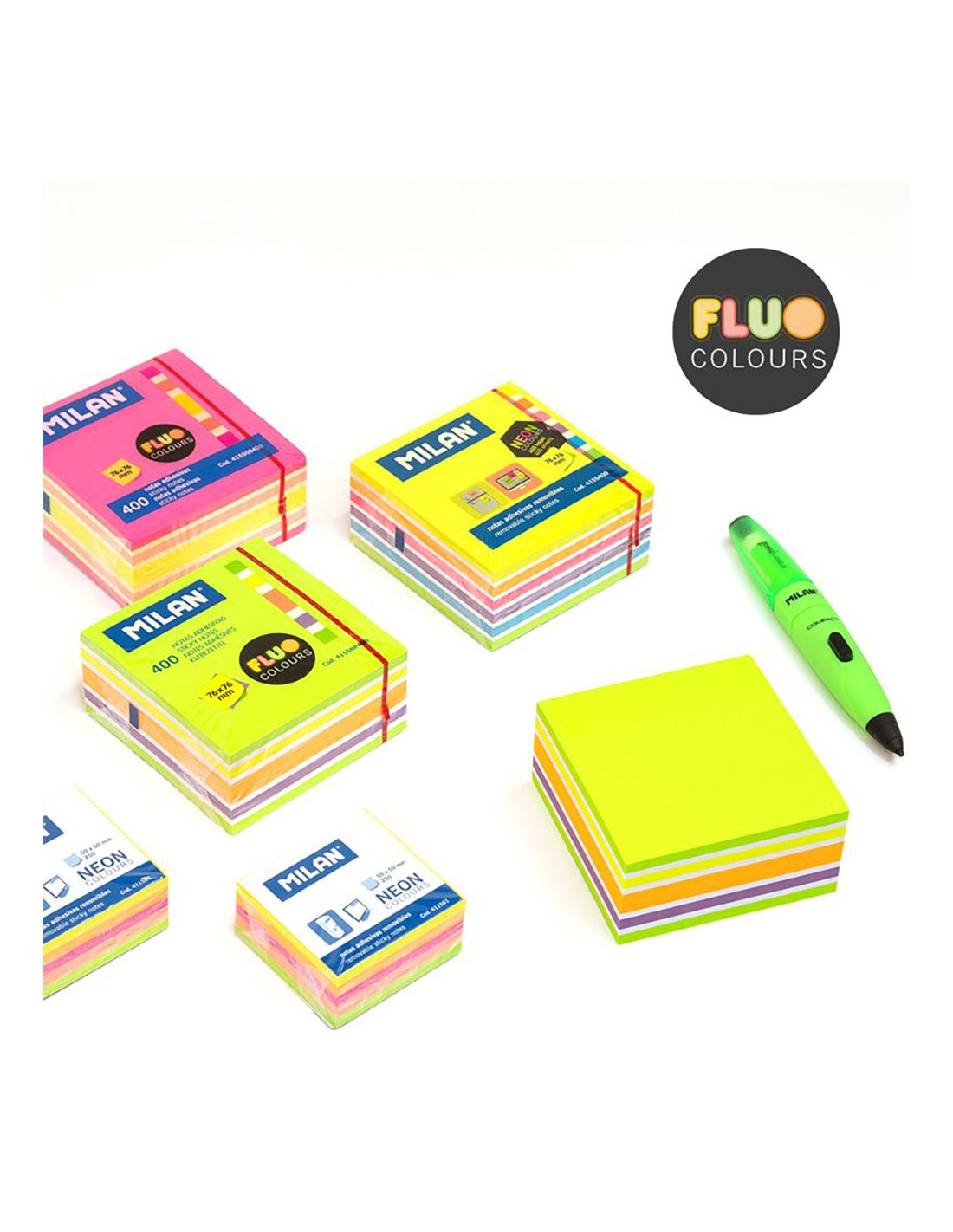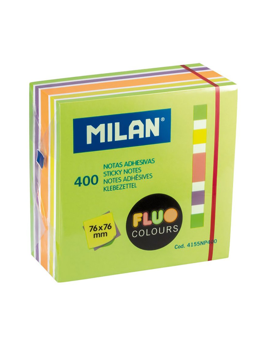 Bloc 400 notas adhesivas colores fluo 76x76mm milan. notas adhesivas removibles en 4 colores fluo, intercaladas con hojas blancas. contiene: 100 hojas color verde, 50 hojas de color amarillo, 100 hojas de color naranja, 50 hojas de color lila y 50 hojas de color blanco. medidas: 76x76mm milan