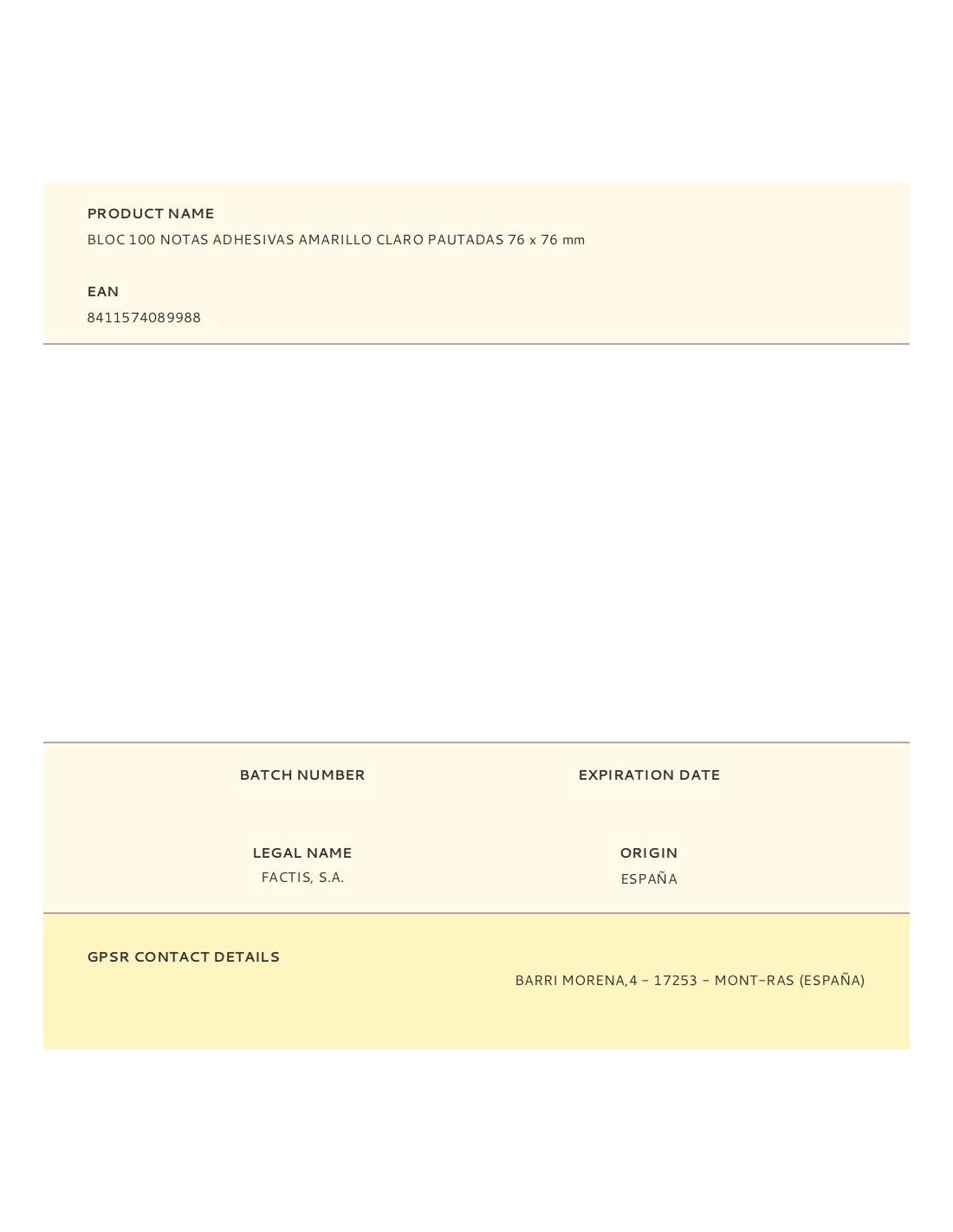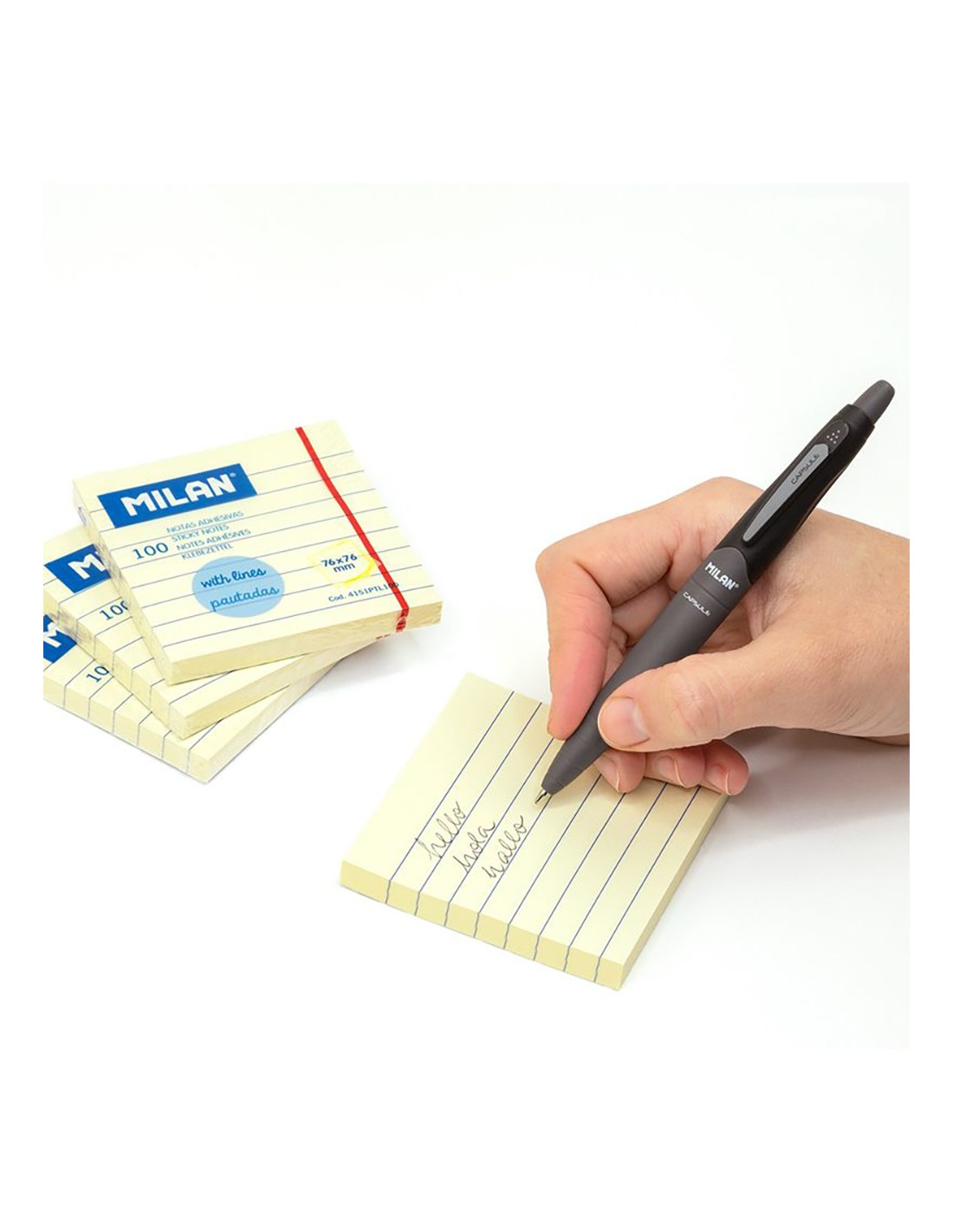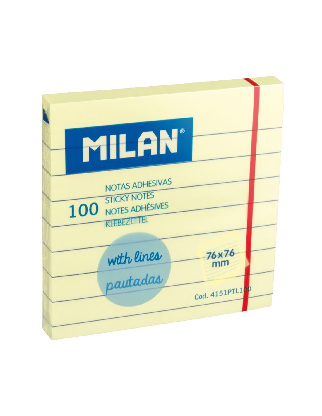 Bloc 100 notas adhesivas amarillo claro pautadas 76x76mm milan.notas adhesivas removibles de color amarillo claro pautadas. líneas de color azul. separación interliniado: 8 mm. medidas: 76x76mm milan