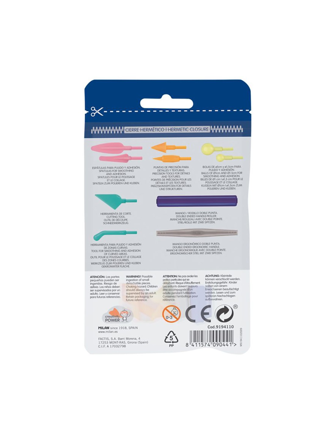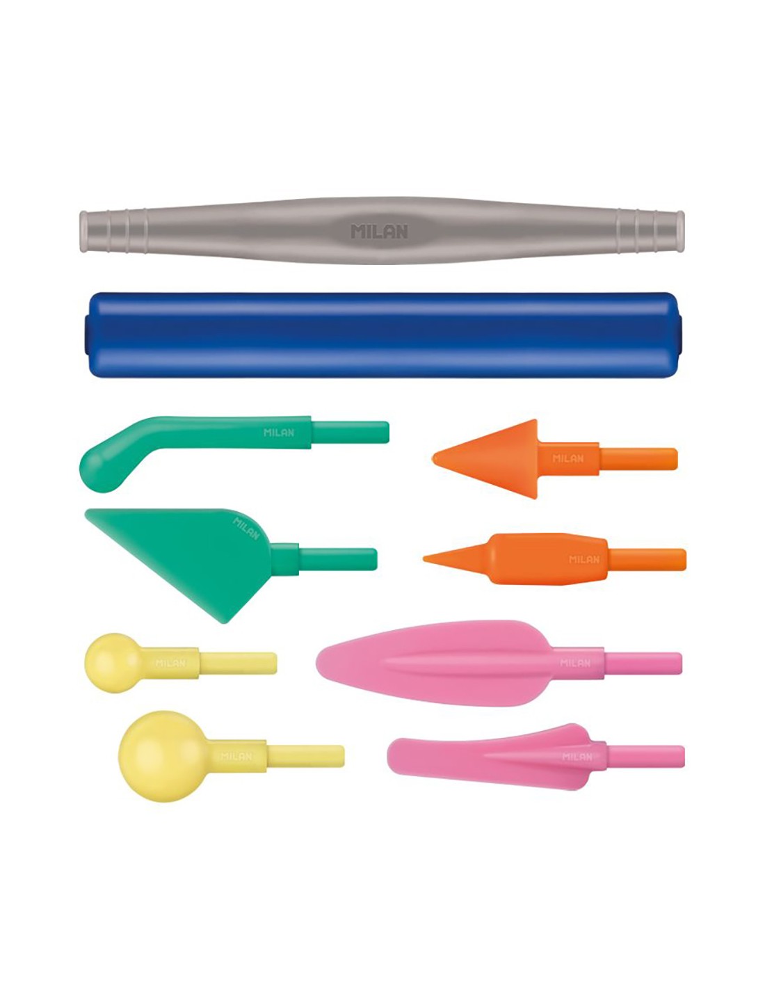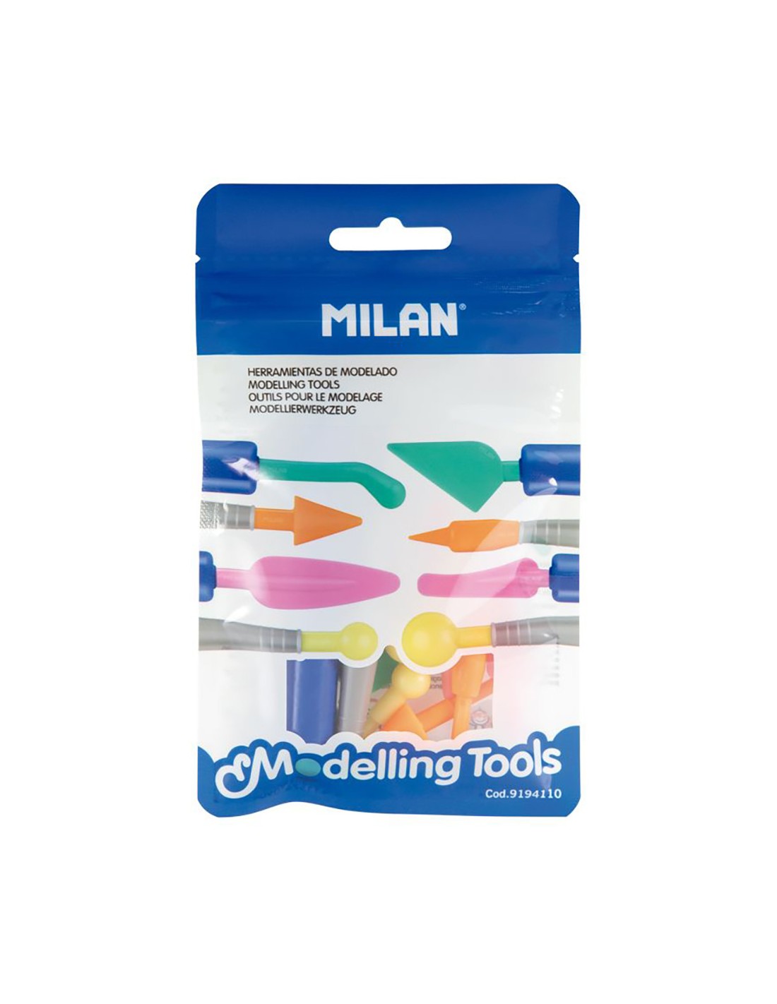 Herramientas de modelado (2 mangos + 8 puntas) milan. bolsa con cierre hermético. herramientas de modelado de plástico. contenido: 1 mango ergonómico de doble punta (color gris), 1 mango/rodillo de doble punta (color azul), 2 espátulas para pulido y adhesión (color rosa), 1 herramienta de corte (color verde), 1 herramienta para pulido y adhesión de zonas curvas (color verde), 2 bolas para pulido y adhesión (1cm y 1,5 cm, color amarillo) y 2 puntas de precisión para detalles y texturas (color naranja).