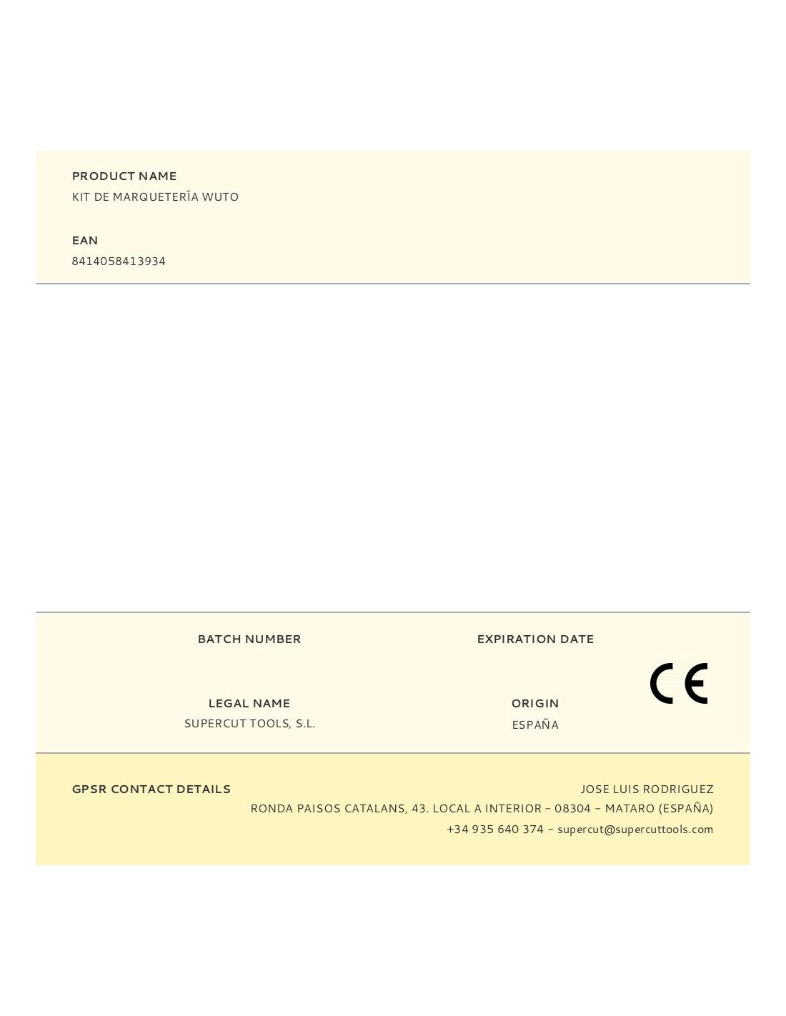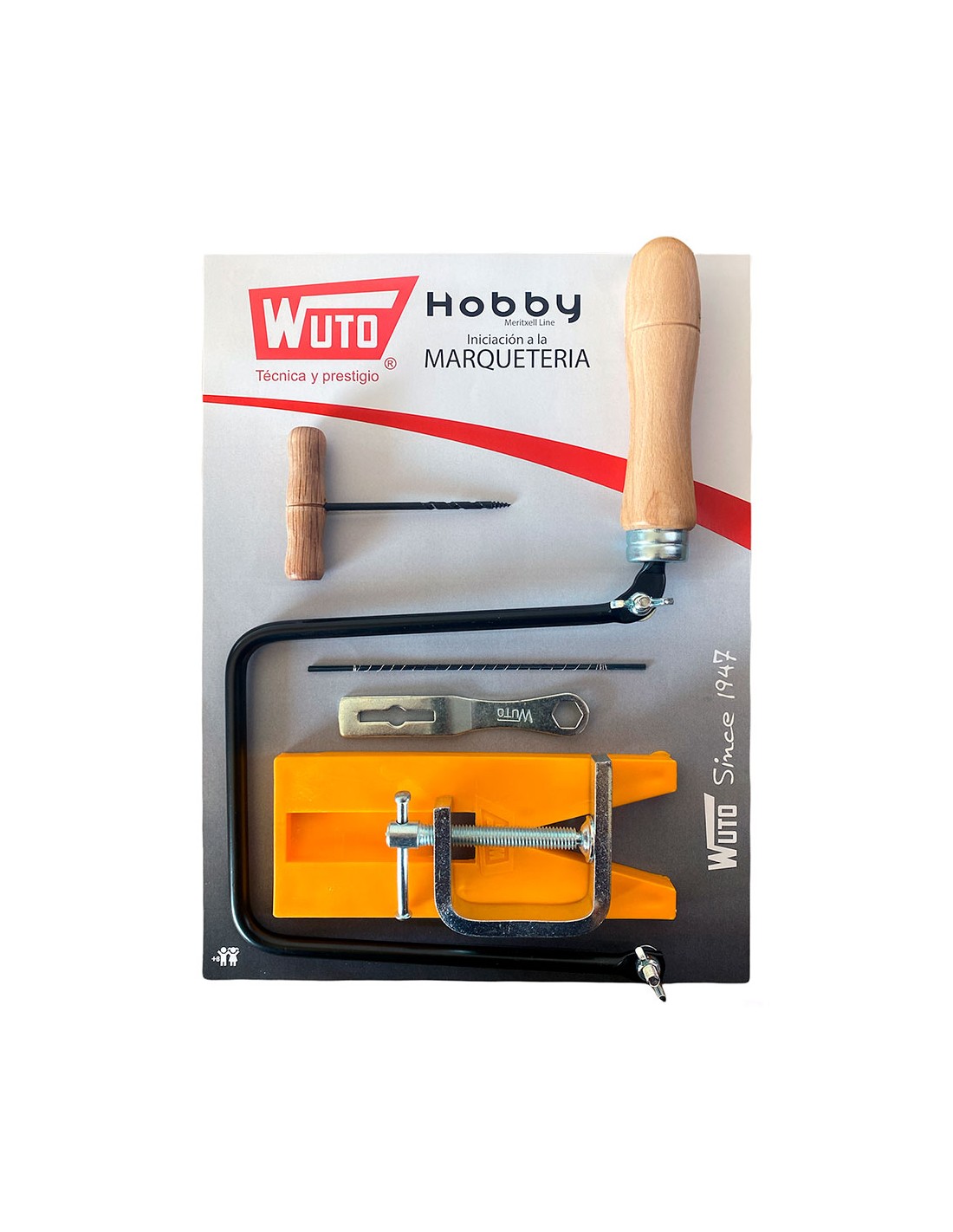 Kit de marquetería wuto. compuesto por: arco c13 130x150mm. brida br50 50x31. 12 pelos de sierra 2/13ma. soporte 180x100mm. llave de apriete. taladro manual para la realización de orificios sin causar fisuras en la madera. con mango de madera y corte vaciado. presentado en blister