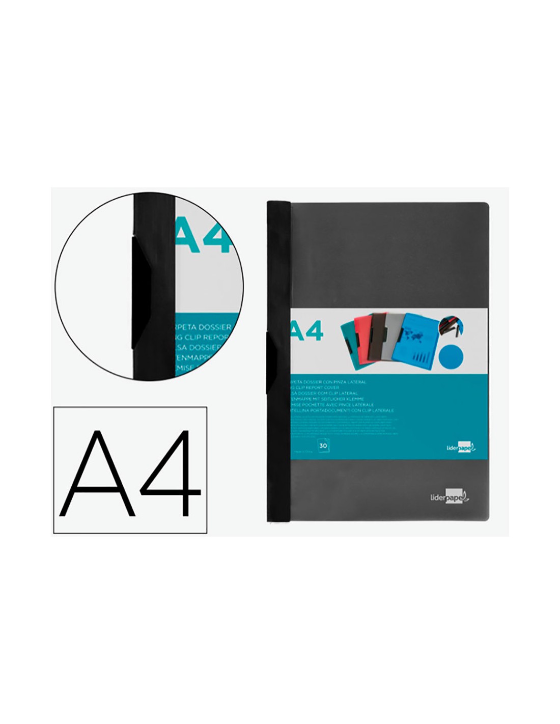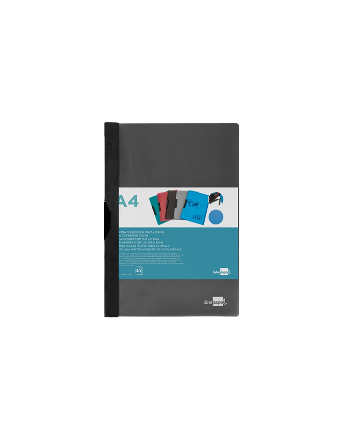 Carpeta dossier pinza lateral pp din a4 negra liderpapel. portada transparente de 180 micras y contraportada opaca. para 30 hojas. pinza deslizante