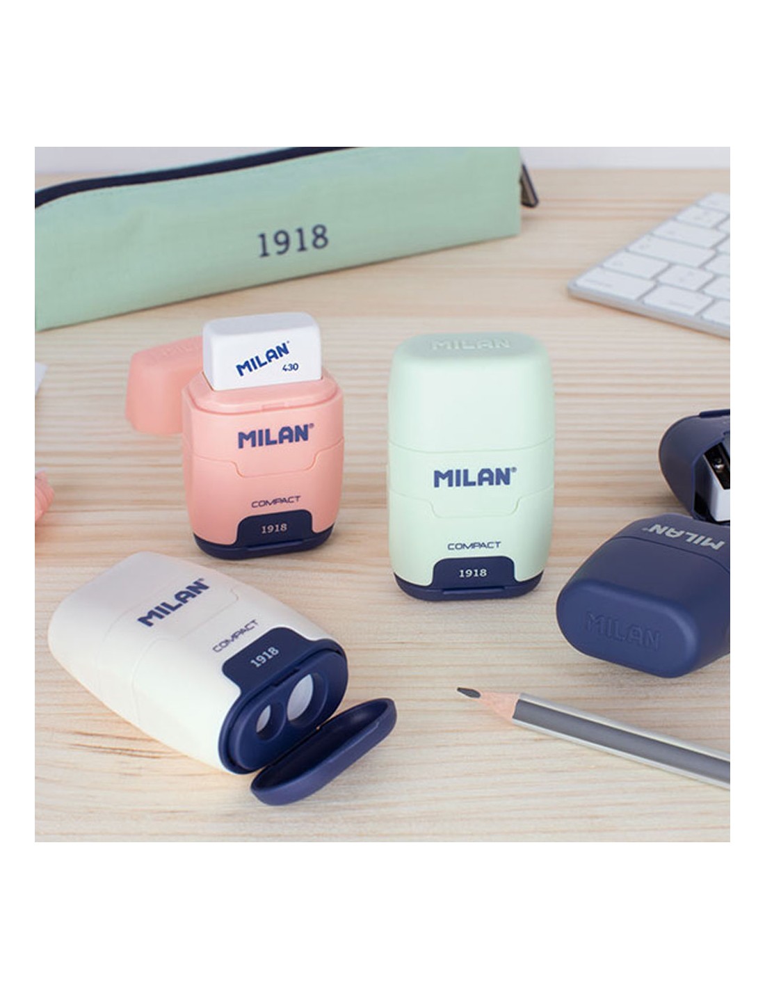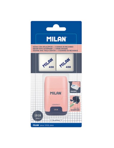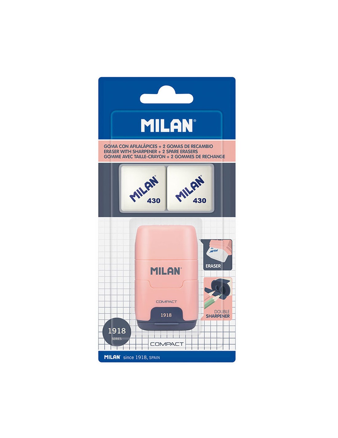 Blister afilaborra compact serie 1918 rosa + 2 gomas de recambio milan. combinación de goma de borrar y sacapuntas doble (uno estándar y otro maxi) con depósito. diseño compact, serie 1918, color rosa. goma cuadrada suave de caucho sintético tipo 'miga de pan'. el sacapuntas dispone de una cuchilla de acero afilada y resistente, ideal para todo tipo de lápices. sacapuntas con cuchilla de seguridad: este sistema evita que se pueda separar la hoja del cuerpo del sacapuntas. diseño original creado por el propio departamento de i+d de milan. incluye 2 gomas de borrar 430 de recambio.
