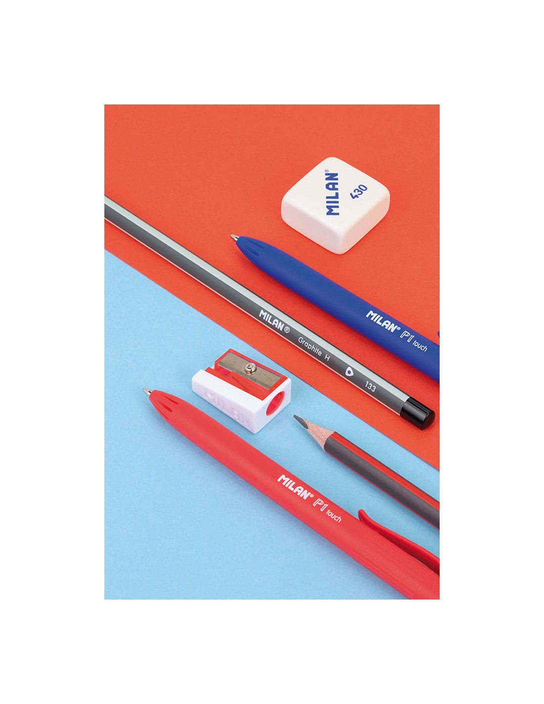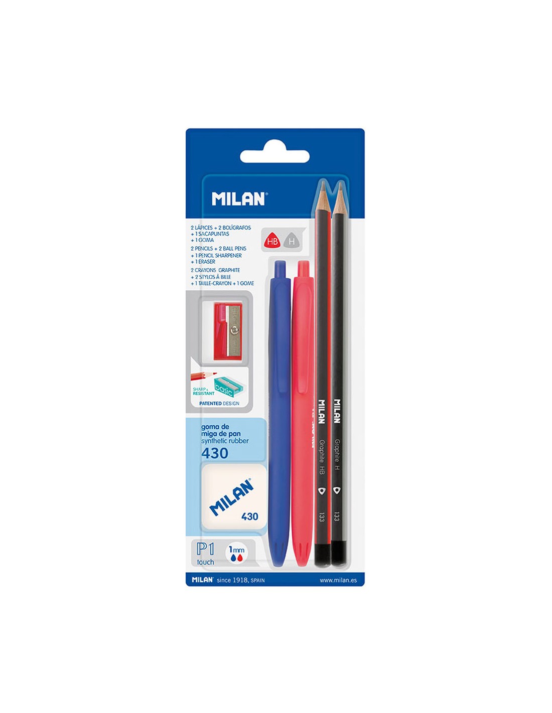 Blister con 2 bolígrafos p1 (azul/rojo), 2 lapices grafito hb y h, goma 430 y sacapuntas milan . incluye: 1 bolígrafo p1 azul y un bolígrafo p1 rojo, 2 lápices de grafito triangulares, graduación hb y h, 1 goma 430 suave de caucho sintético tipo "miga de pan", para borrar una amplia gama de lápices de grafito sobre toda clase de papeles, y 1 sacapuntas basic. colores / modelos surtidos