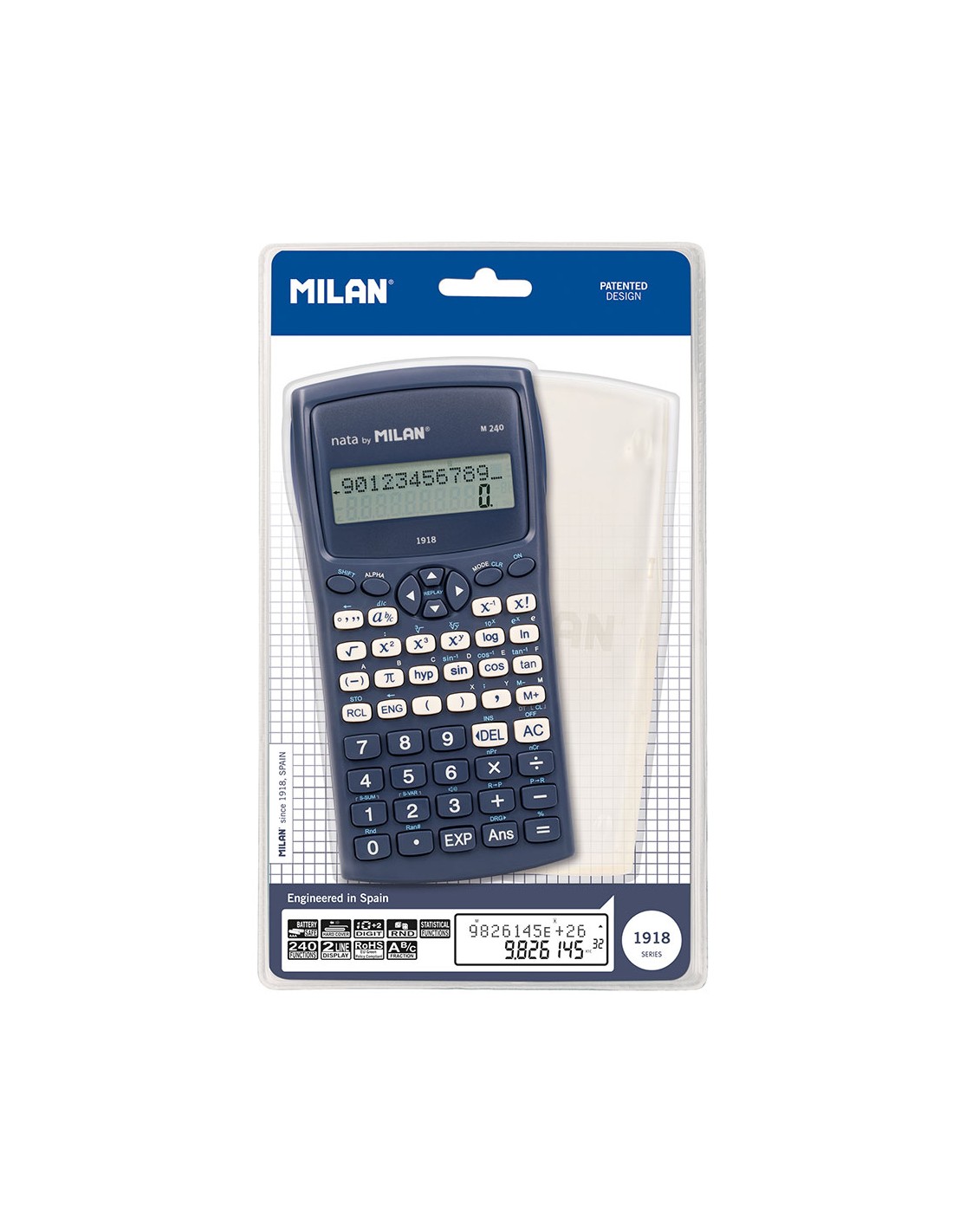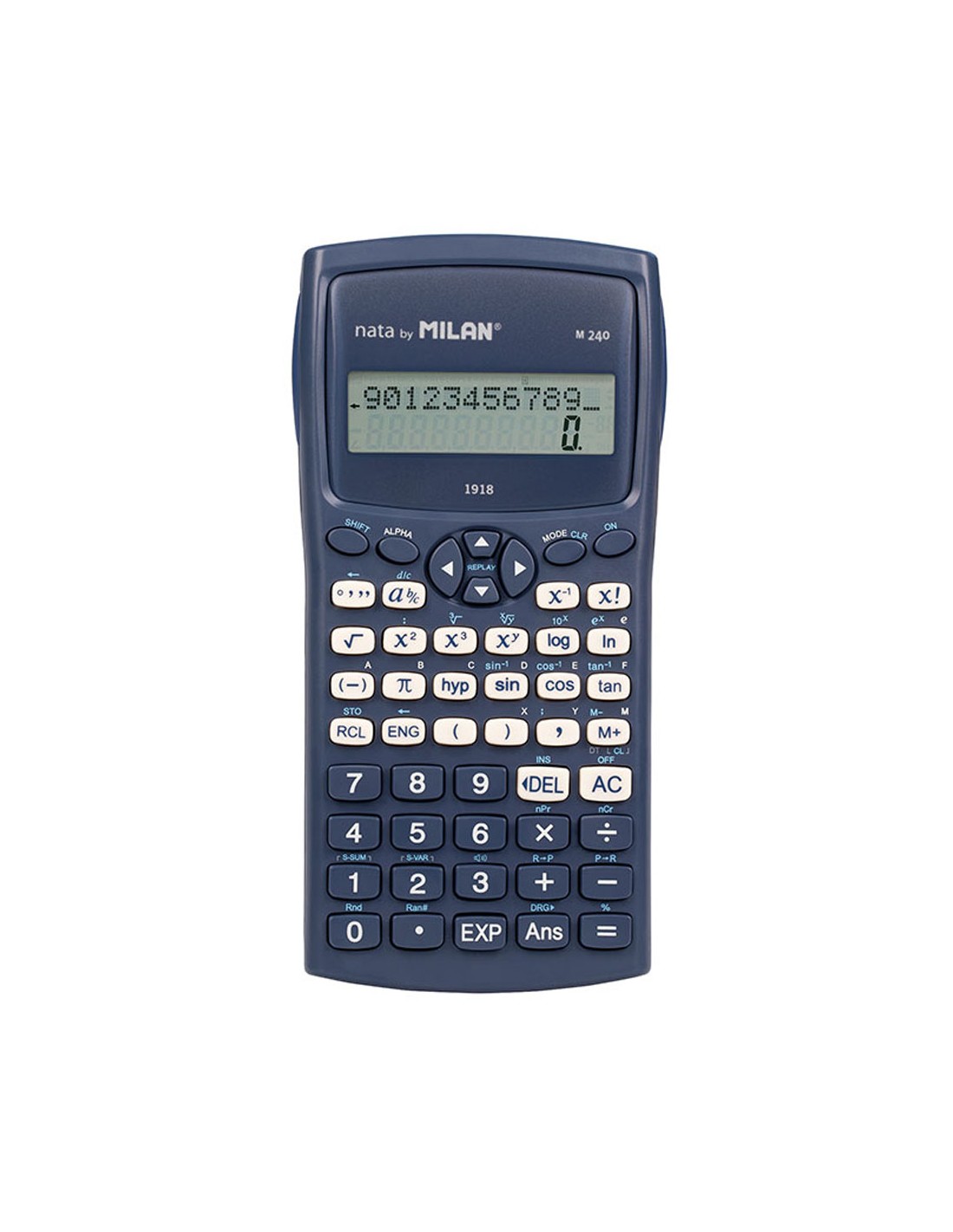 Calculadora científica m240 serie 1918. color azul. con resistente carcasa protectora translúcida. pantalla de 2 líneas de lectura, de 10+2 dígitos. visualización de expresión y resultado de manera simultánea. 240 funciones integradas, incluyendo 124 científicas. funciones trigonométricas, funciones parabólicas e hiperbólicas y cálculo de hasta 6 tipos de regresión diferentes memoria para almacenamiento de medias. cálculo automático de quebrados, teclas de cursor para desplazarse por los menús, estructuración de paréntesis de hasta 24 niveles, memoria para almacenar las variables, cómputos en grado centesimal, sexagesimal y medida de arco, transformación mutua entre coordenadas rectangulares y coordenadas polares, conversión mutua entre sistemas decimal y sexagesimal, generador de valores aleatorios, porcentajes, fracciones, combinaciones, permutaciones, cálculos estadísticos, teclas grandes con disposición estructurada, funciones de notación sci/fix/eng, formación de sumas. alimentación: 2 pilas aaa (incluidas). medidas: 16,7x8,4x1,9cm.