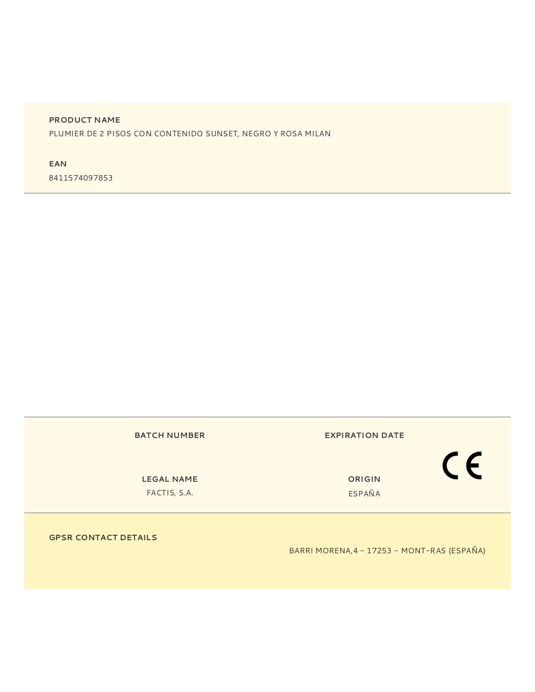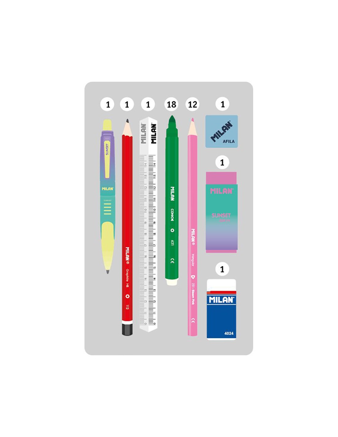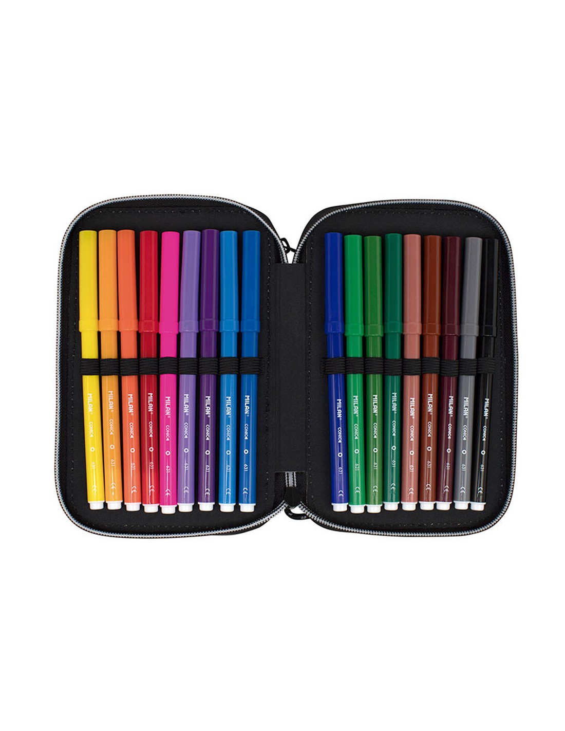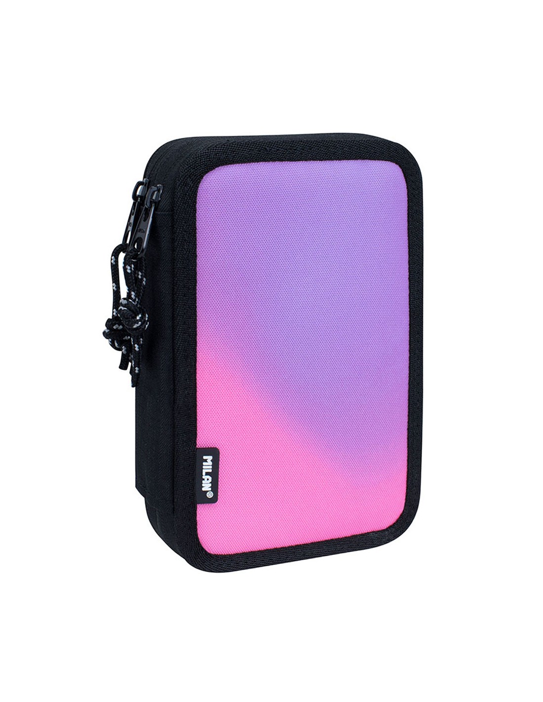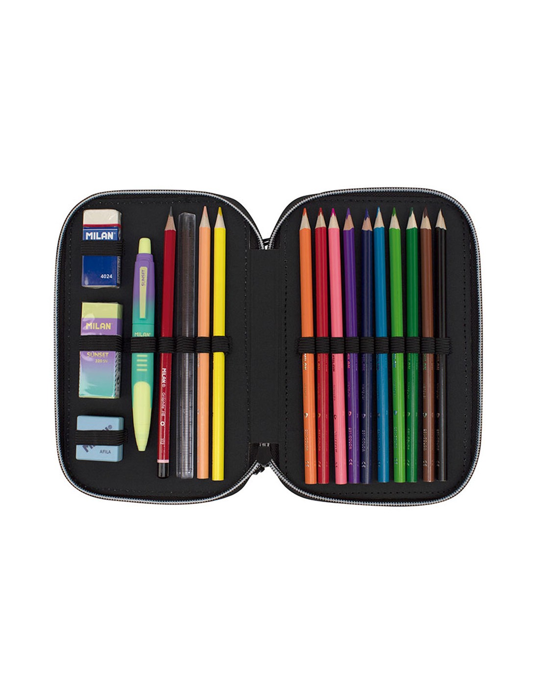 Plumier de 2 pisos con contenido sunset, negro y rosa milan. plumier de 2 pisos que permite mantener el material escolar siempre ordenado y de fácil acceso. serie sunset, color negro y rosa. una combinación de colores degradados inspirados en el atardecer, acompañados de detalles en blanco y negro. tiradores de las cremalleras con cuerda. material escolar incluido: 2 gomas de borrar (4024 y nata® 320 sunset rosa), 1 sacapuntas afila, 1 lápiz de grafito hb, 1 bolígrafo compact sunset tinta azul, 1 regla triangular de 15 cm, 12 lápices de colores triangulares y 18 rotuladores de punta cónica. tejido posterior 'ripstop': ligero y resistente a la rotura y rasgaduras. utiliza una técnica especial que teje hilos gruesos de refuerzo a intervalos regulares en un patrón entrecruzado. composición tejido: exterior y forro interior de poliéster. medidas: 19,5x13x5cm.