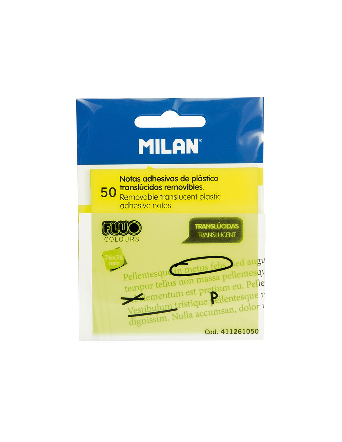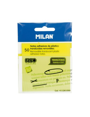 Bloc 50 notas adhesivas translúcidas amarillo fluo 76x76mm milan. notas adhesivas de plástico translúcidas y removibles. permiten escribirfácilmente y hacer anotaciones con lápiz o bolígrafo. color amarillo fluo translúcido. 76x76mm.
