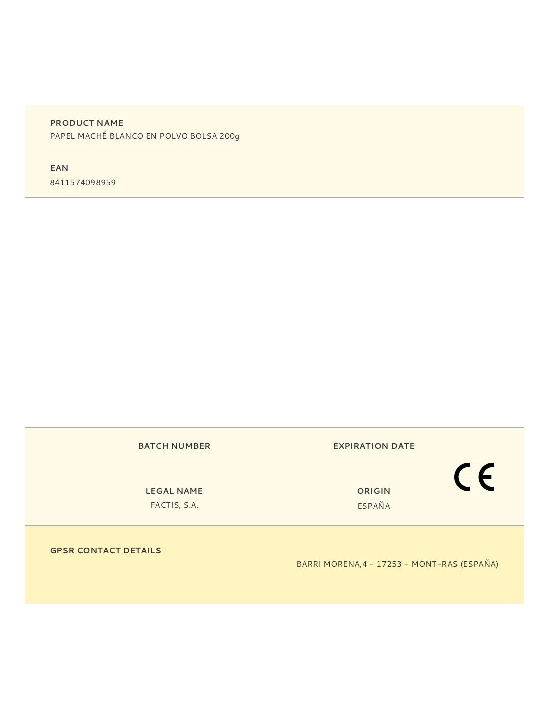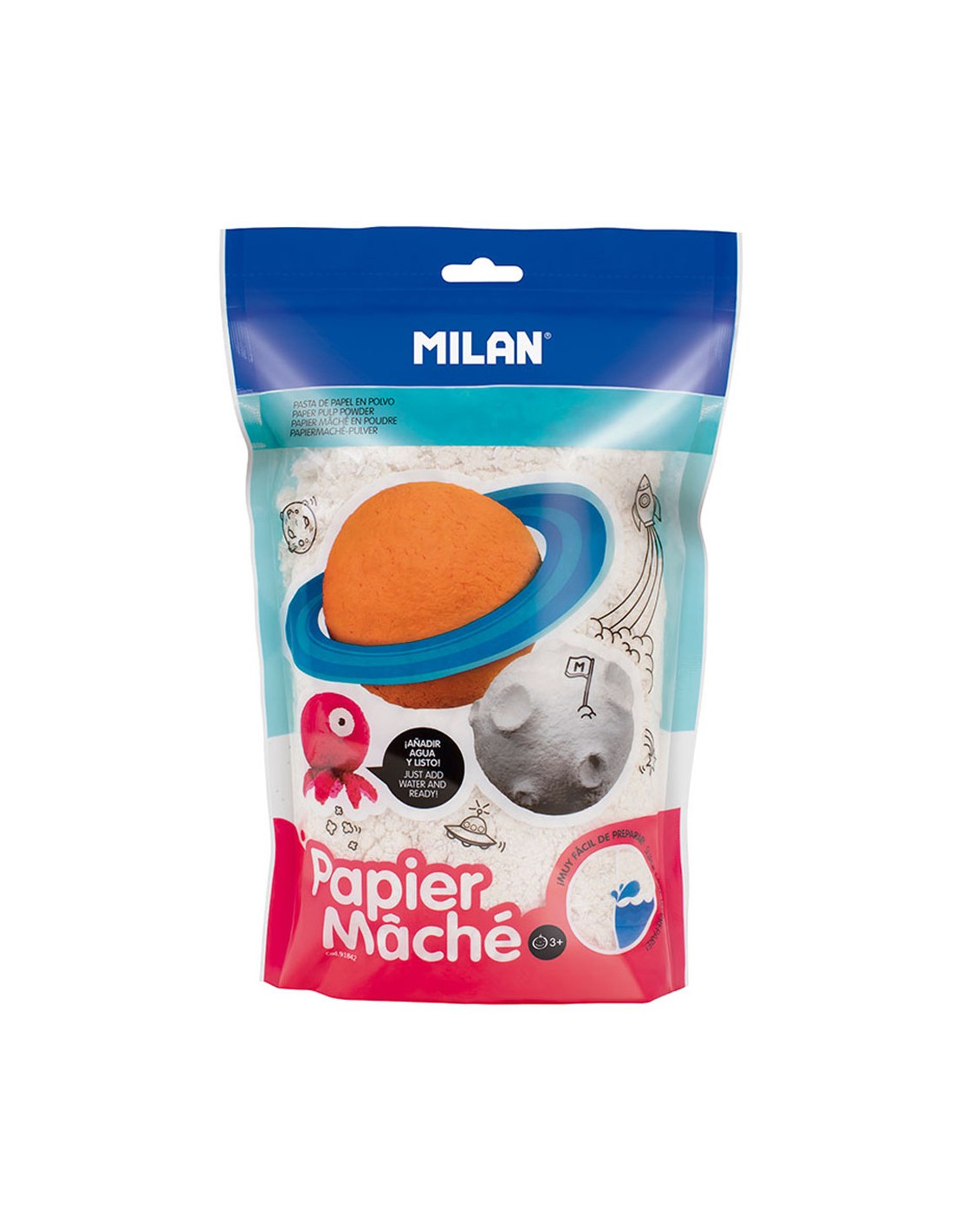 Bolsa 200g papel maché blanco en polvo milan. papel maché en polvo, muy suave y de color blanco. para formar pasta. secado al aire (tiempo de secado aproximado: a partir de 48h dependiendo del grosor y las condiciones ambientales). instrucciones de uso: mezclar 3 partes de polvo con 1 de agua hasta que quede una pasta homogénea. aplicar la pasta sobre la superficie con un grosor aproximado de 2 a 3mm y cubrir de forma uniforme sin dejar huecos ni burbujas. una vez seco, se puede pintar con témpera o pintura acrílica y decorar con otros elementos como cartulinas o adhesivos.